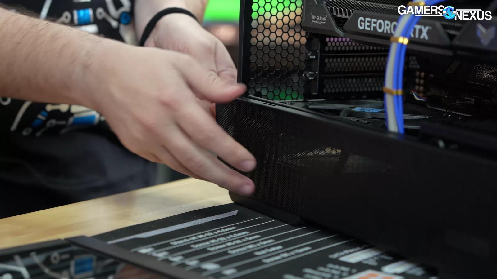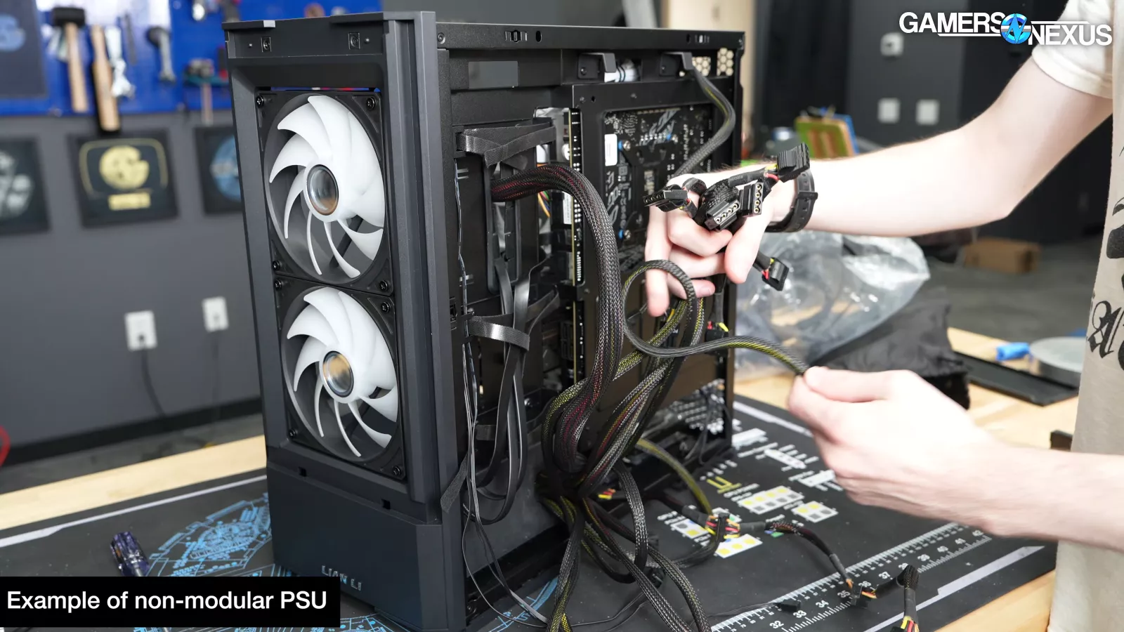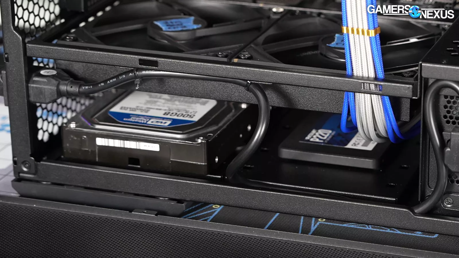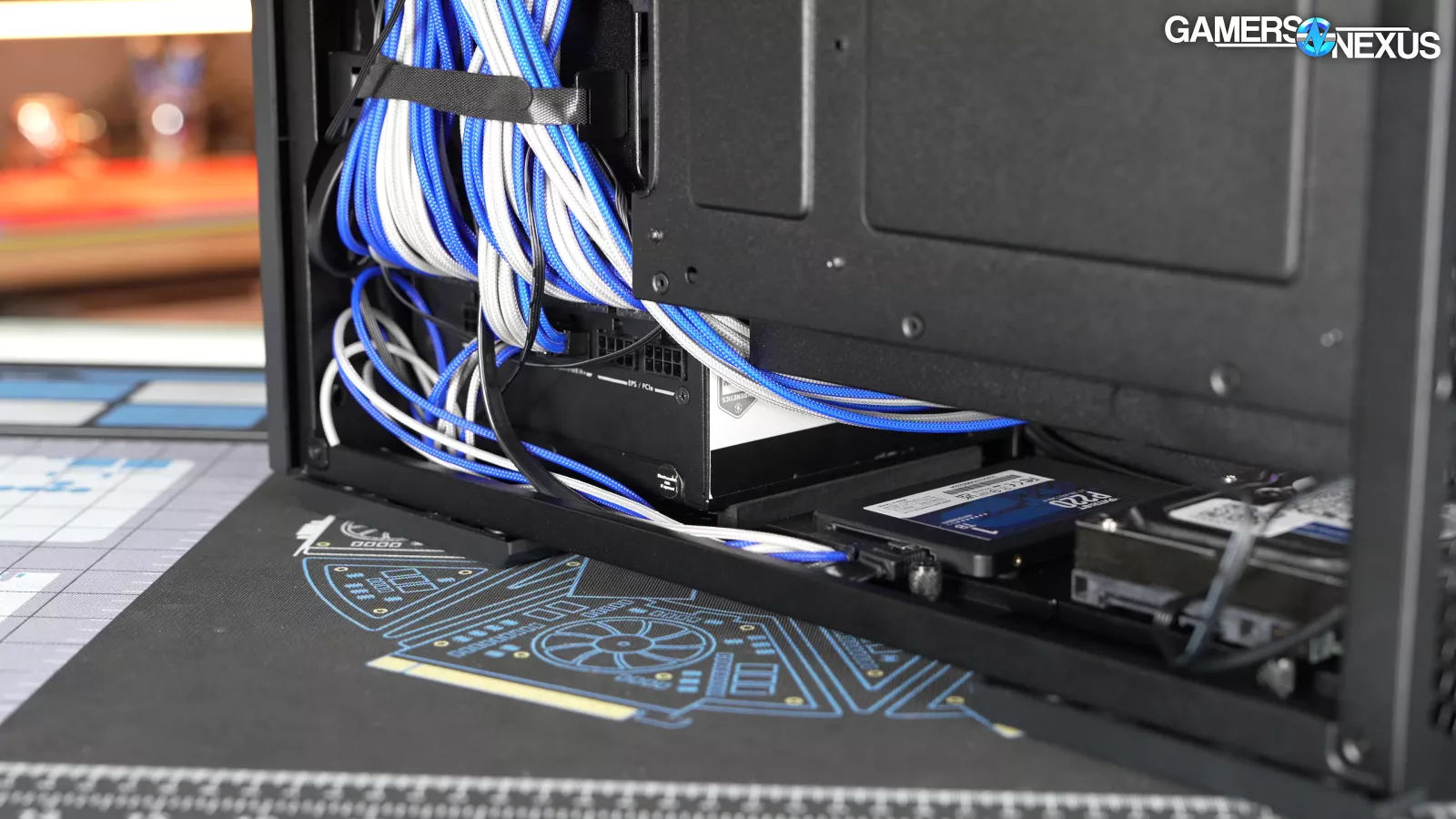 In another major concern, in Lian Li’s quest to move the power supply, it has overlooked both cabling and cooling considerations. With the bottom filter installed, which we’ll come back to, the power supply is given mere millimeters to breathe with a bottom-oriented fan. We don’t currently run power supply thermals during our testing; however, this will cause the power supply to heat up, objectively, and it may result in the PSU fan running at a higher RPM (if it is a power supply that bases fan speed on any internal temperatures).