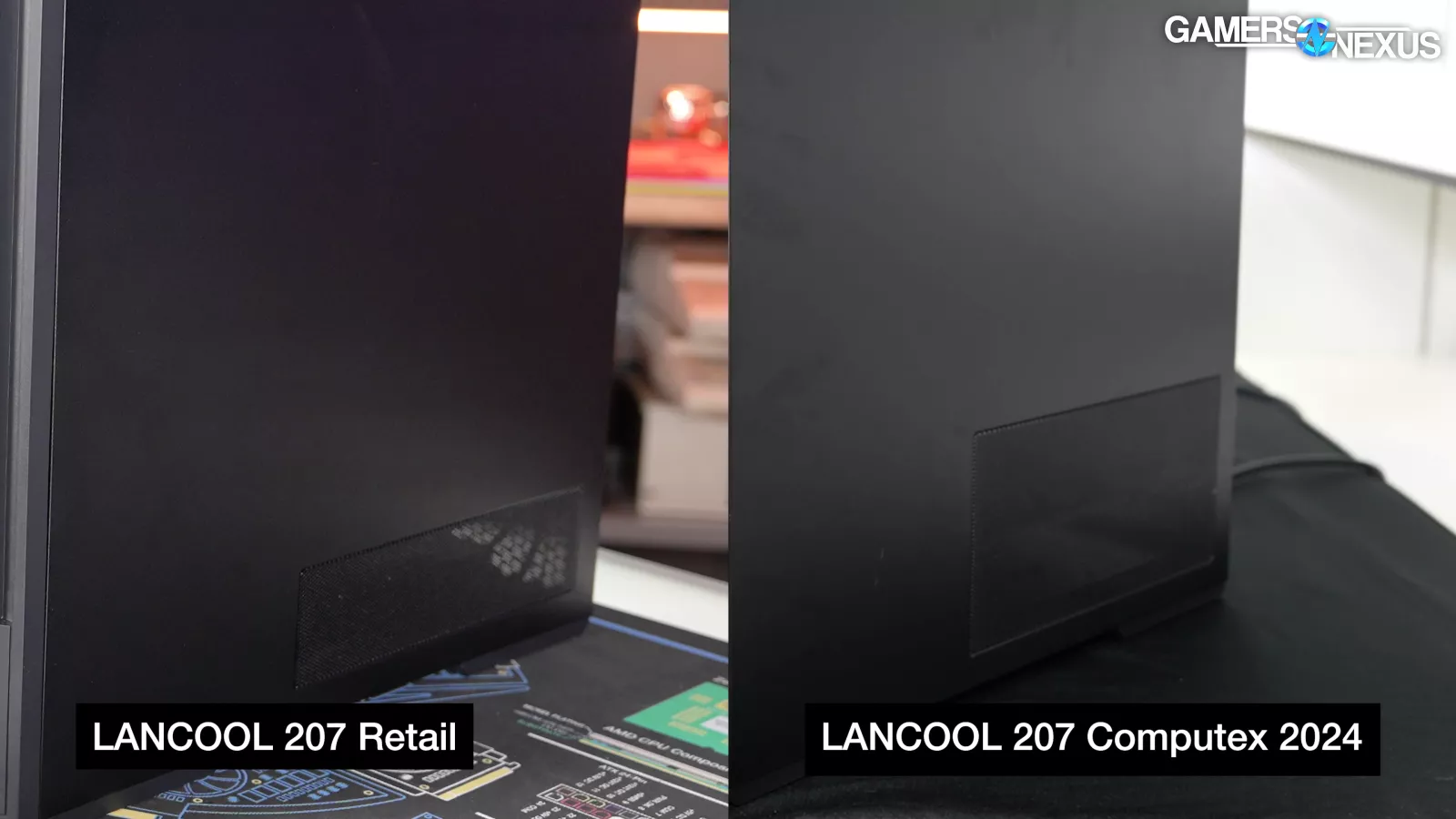 We saw the 207 at Computex earlier this year. We've spotted a few changes to the case since that Computex showing: the weird removable plate at the bottom of the front panel is gone, the bottom intake fans are conventional rather than reverse-blade, and the side panel vent is smaller. None of these changes are meaningful from a consumer perspective. The removable plate never had an assigned function other than to possibly be “DLC” add-ons, the bottom intake fans look basically the same, and the functional area of the side vent hasn't changed.