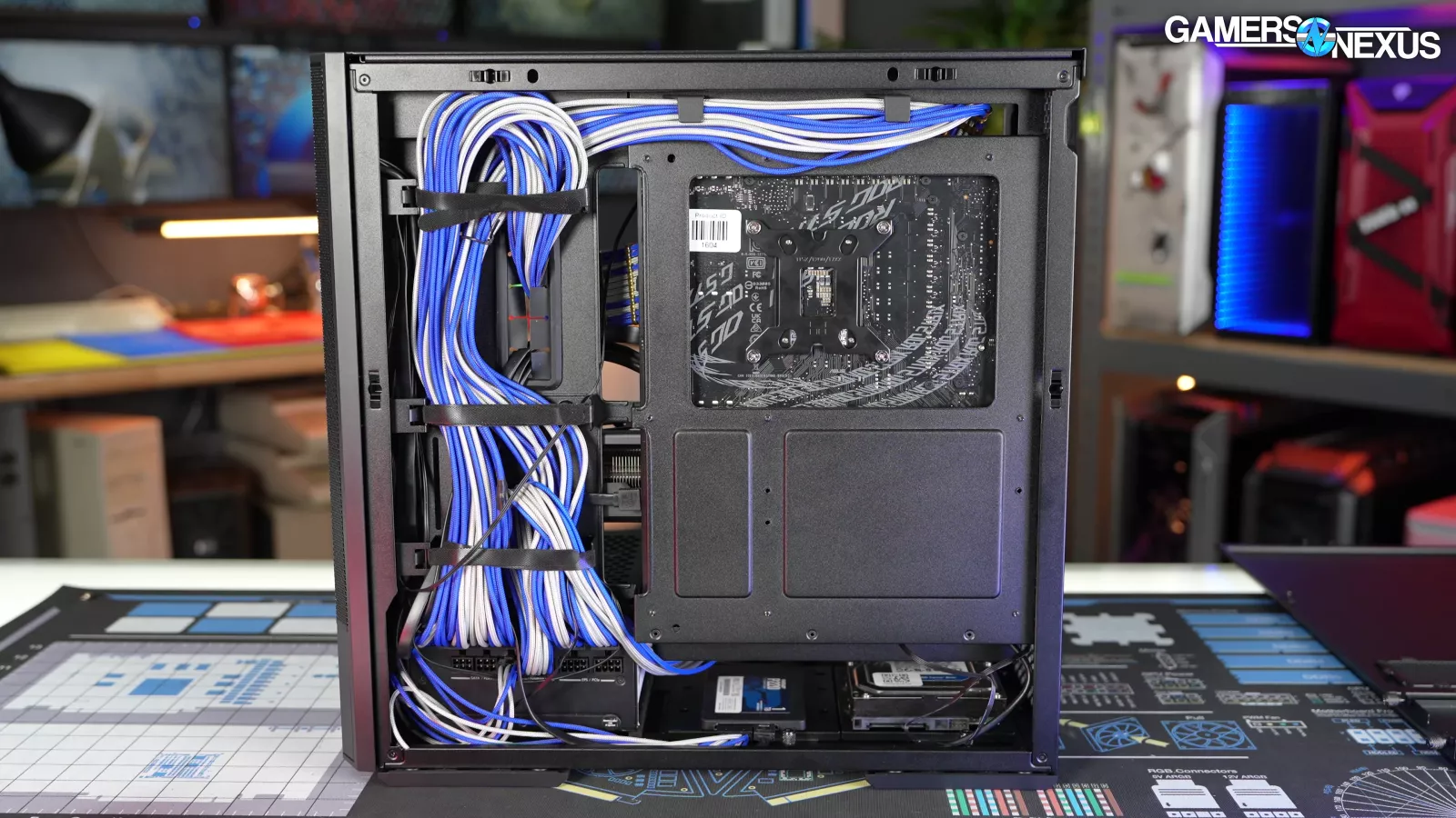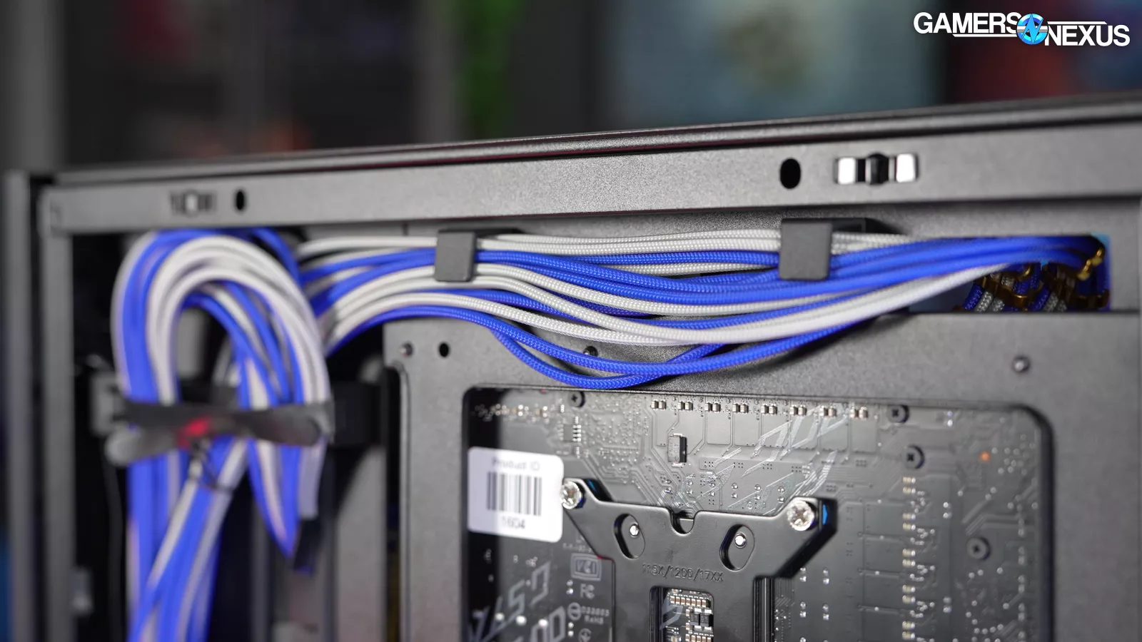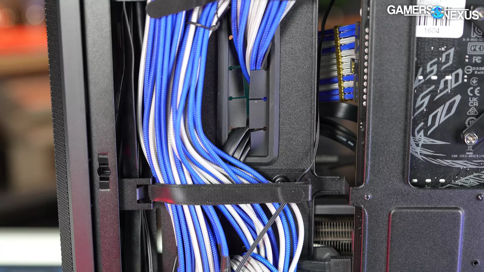 On the cable management side on the back of the case, the attachment points for the built-in velcro straps are angled so that the straps curl over as they're inserted, which is a much bigger quality of life improvement than it sounds like. The manual describes intended cable paths, most of which are obvious, but there are specific routes for 24-pin STRIMER cables and for CPU 8-pin cables. The 8-pins are held in by plastic hooks, but the hooks might work better if they were flipped. There isn't a suggested path for GPU power cables in the manual. This is something we would have liked to see for new builders.