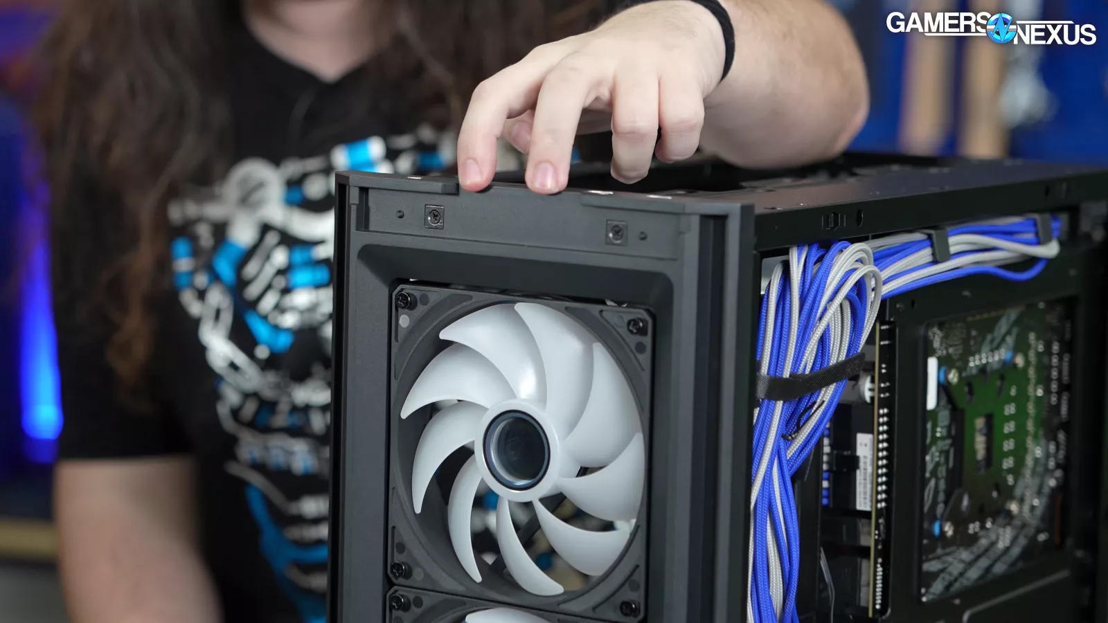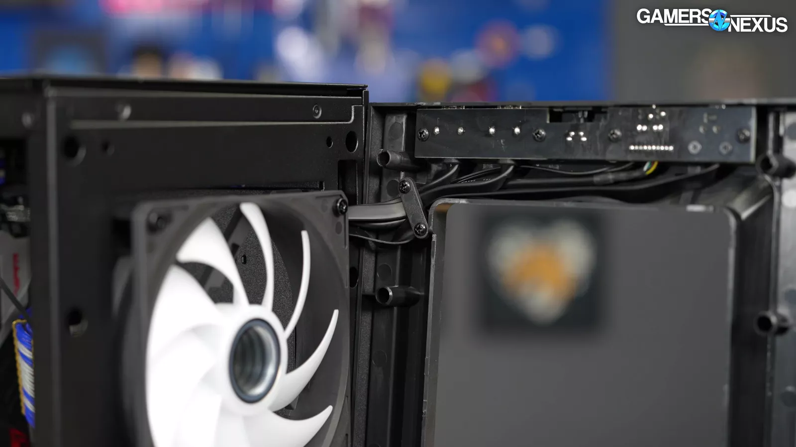 Each pair of fans has 1x four-pin fan connector and 1x three-pin ARGB connector, and the two fans within each pair are linked by proprietary connectors. We'll begrudgingly accept this as a compromise since it cuts the number of fan cables in half. The downside is that it's impractical to replace or reconfigure individual fans, contributing to a larger downside of having to go through Lian Li for replacements if one breaks. The front and bottom mounts aren't compatible with any sizes other than the ones that are preinstalled (140mm front, 120mm bottom). On top of that, the front mount is built around Lian Li's 30mm-thick fans, and all four stock fans are attached with radiator screws. If you still want to replace any, Lian Li includes 16 additional screws sized for 25mm-thick fans. All of this is non-standard and will be unfamiliar to experienced builders. It’s workable, but it will impose atypical limitations on fan compatibility if you want to change them. For instance, you’d typically have 120mm options where 140mm fans install. Here, that’s not the case. The upside is that there’s one less set of rails obstructing intake at the cost of flexibility, so Lian Li is going for the focused airflow approach.