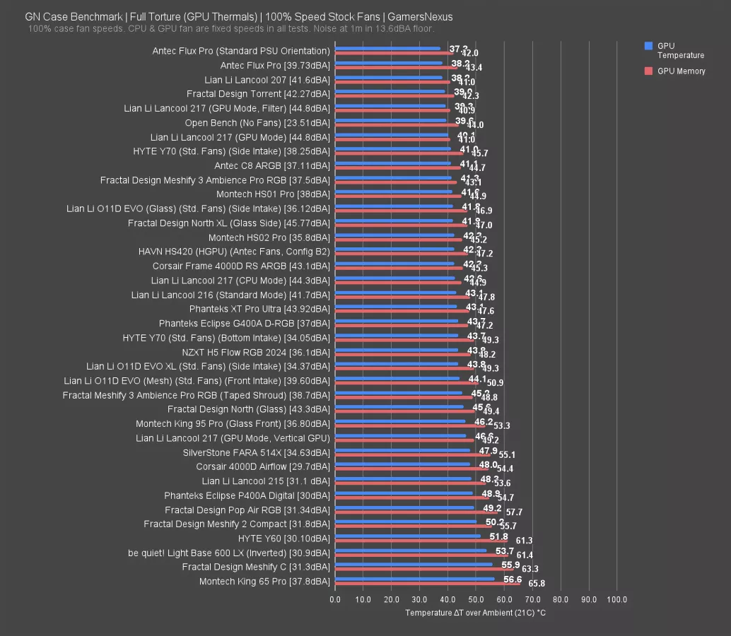 The GPU Mode 217 outperformed the Meshify 3 and HS01 Pro by about one degree, but it's also audibly louder than either of those cases, while the Flux Pro manages to be both cooler at 38 degrees and quieter at 39.7 dBA in comparison to the 217.