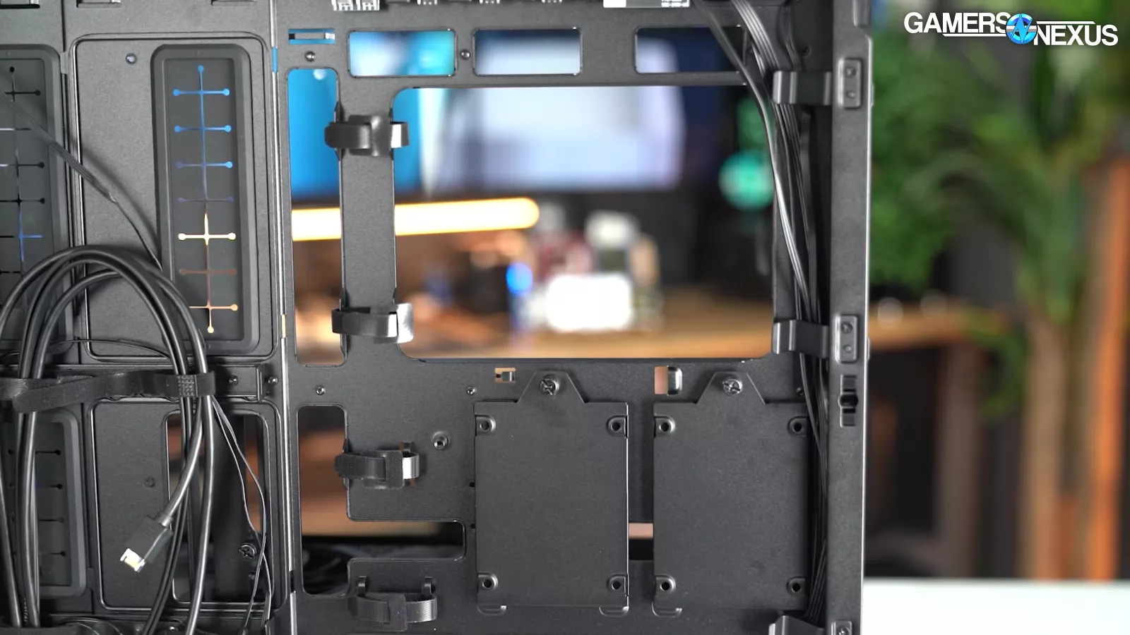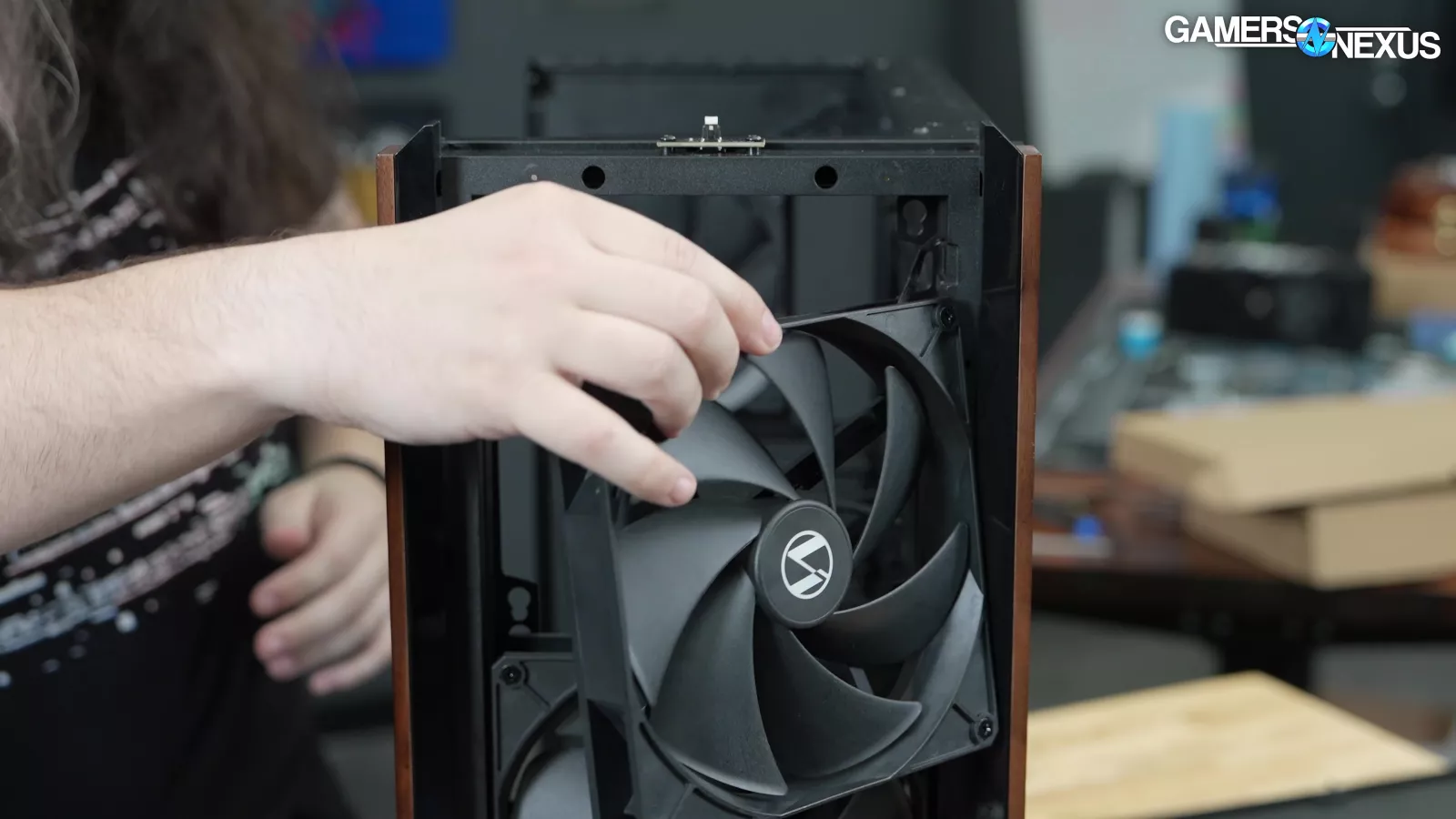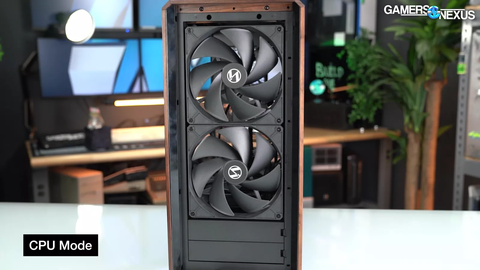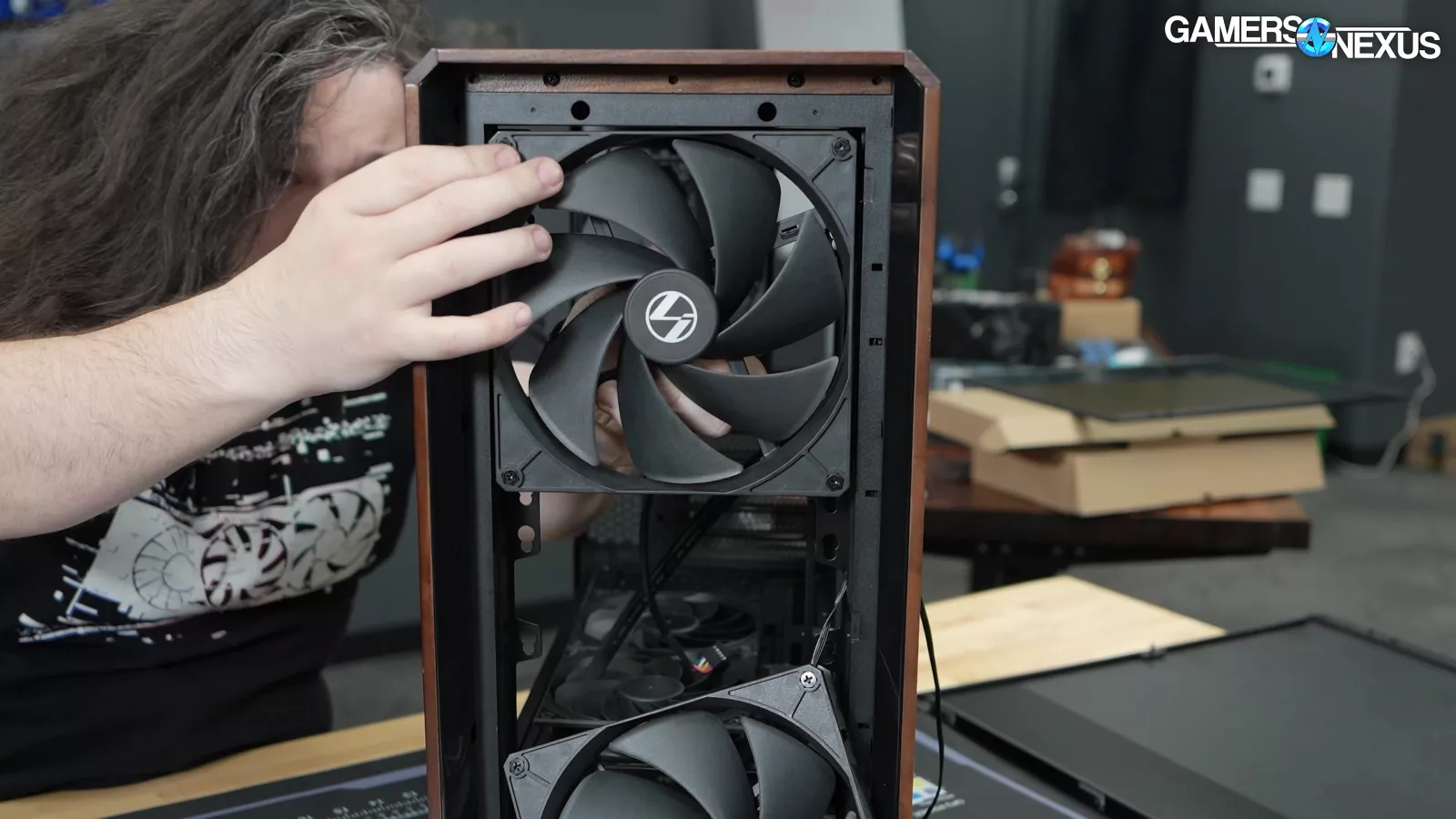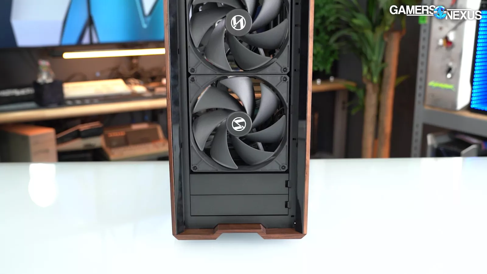 Let's start with "CPU Mode" and "GPU Mode." This is something Lian Li has done in the past but have changed their execution this time. The two front 170mm fans are attached tool-lessly by screwing rubber washers onto the fans and then sliding them into place, a common method for installing storage drives. Between these fans, two plastic blanks can be inserted like old-school 5.25" covers. The blanks also help to guide flow and prevent re-circulation.