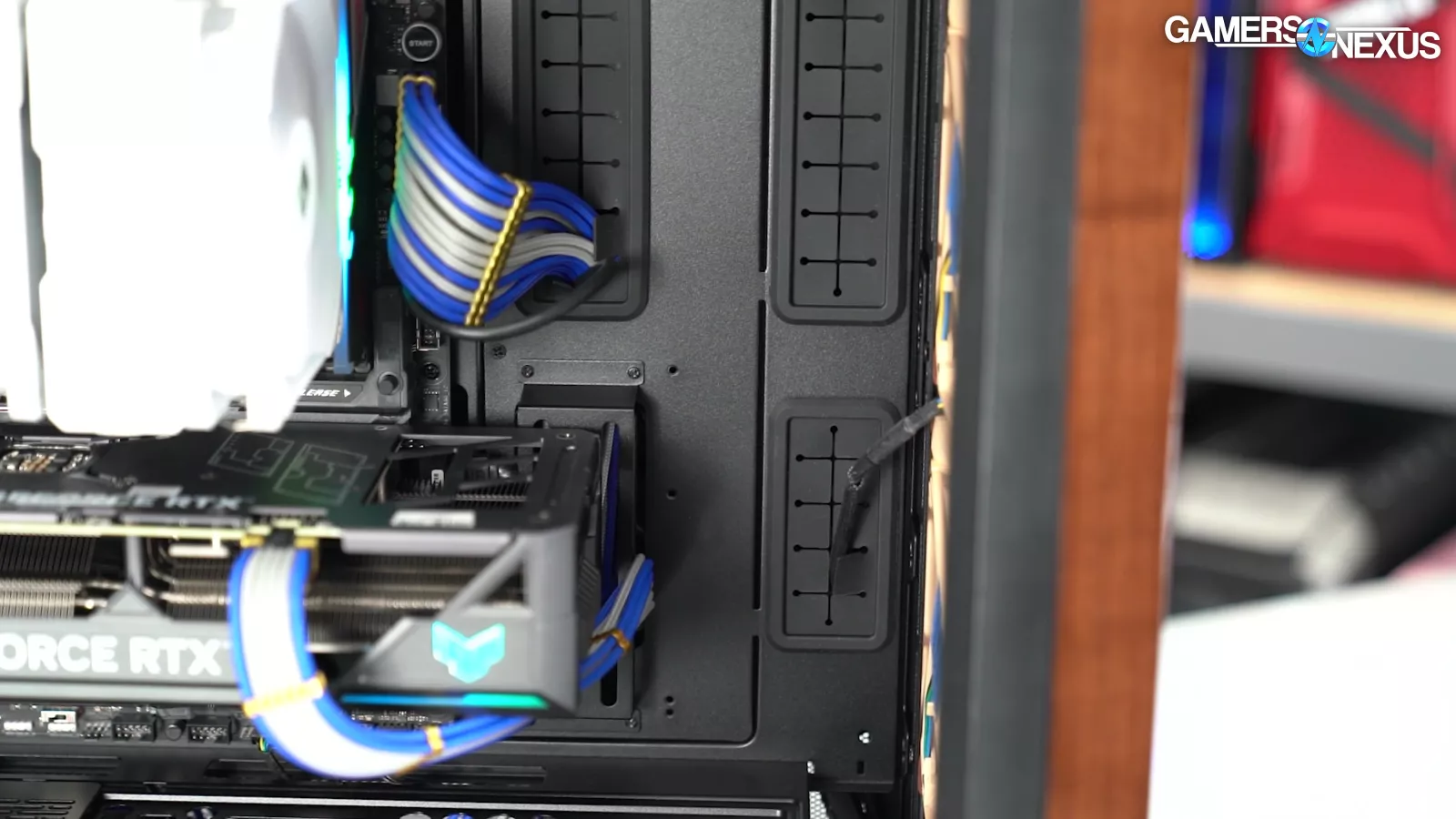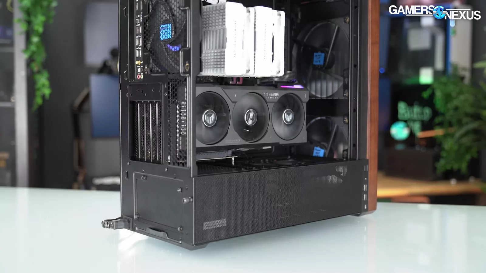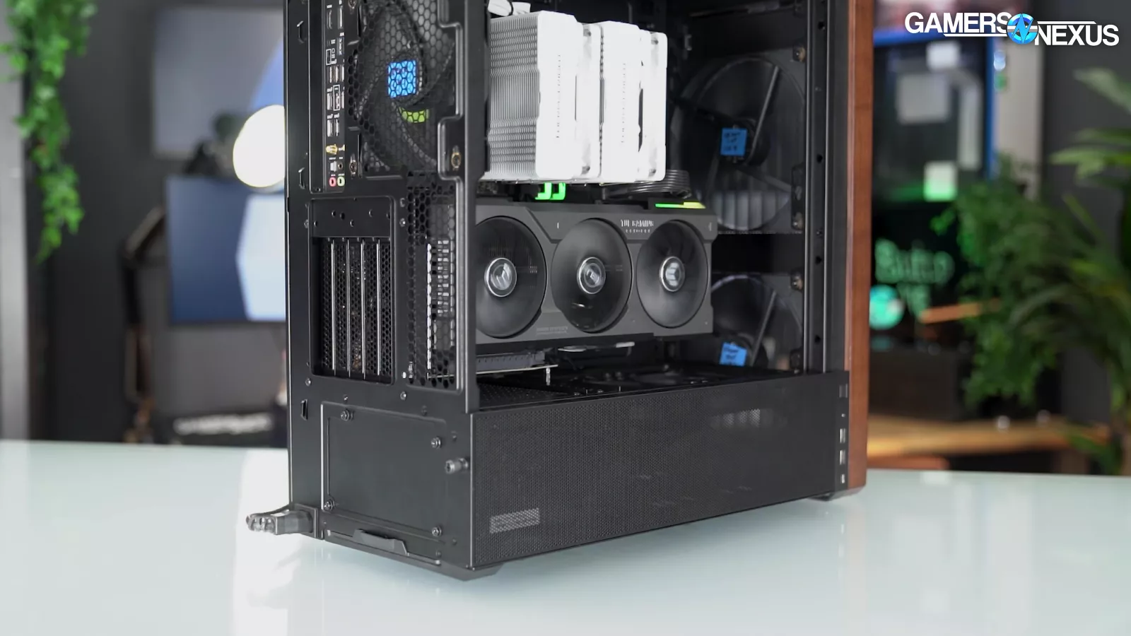 The case also has a 90-degree rotated PSU mount and an elaborate vertical GPU mount that's compatible with shroud-top fans for once, although it requires a separately-purchased riser cable to use.