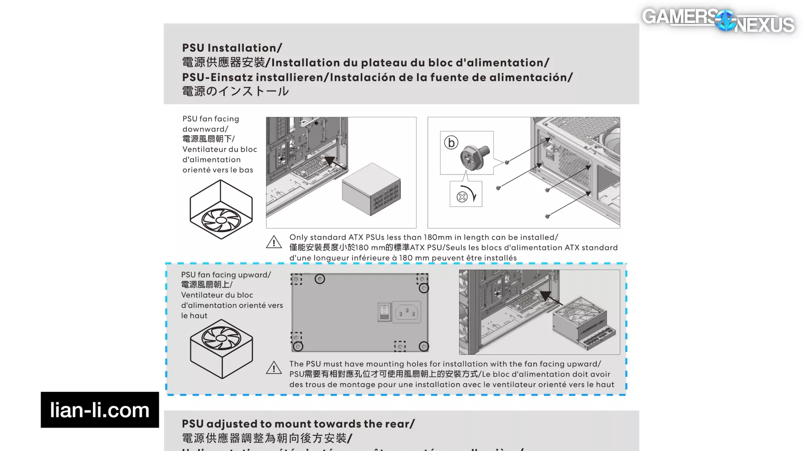 PSUs can be mounted in either "Standard Mode" for up to 220mm length or "Rotated Mode" (the default) for up to 180mm length. As with the Lancool 207 (read our review), we suggest sticking to shorter (~150mm) PSUs in rotated mode to allow extra room for cable bends.