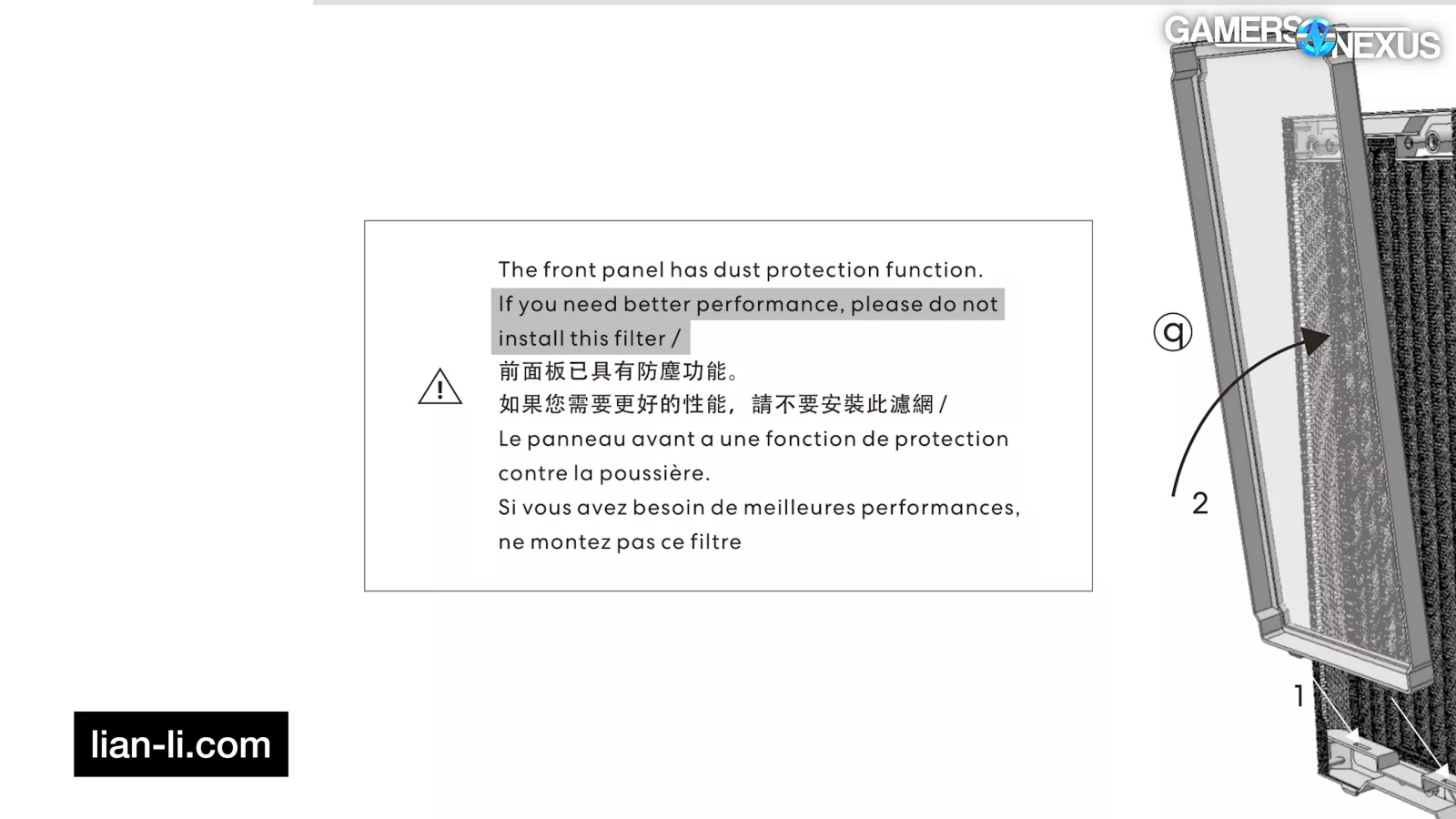 Installing the front filter had no significant effect on thermals or noise in this test, which isn't something we see often, so Lian Li deserves some credit. Technically the result with the filter installed had a slightly cooler average than without, but within our one degree margin for test variance, and the GPU memory temperature stayed at 41 degrees for both tests. This is within error. That means that the filter has minimal impact on GPU thermals in our test, so it isn’t that obstructive. That’s good for Lian Li.