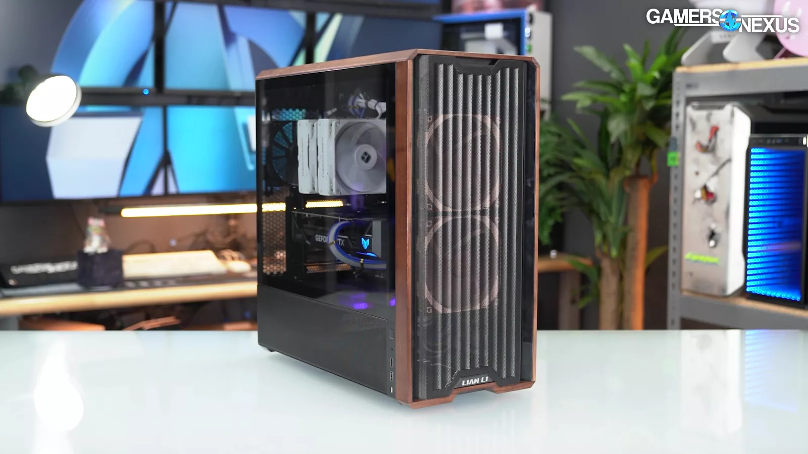 Today we’re reviewing the Lian Li Lancool 217. It's a $120-$125 case and uses weirdly sized fans at 2x 170mm for front intake. Internally, the case comes with 3 more fans. And they're interesting because they are 11-blade ones. The case also comes with wood paneling on the sides, and a lot of mesh ventilation on the front of the case. The lower quarter-panel of the left side also uses mesh to feed intake to the GPU directly via shroud-top holes.