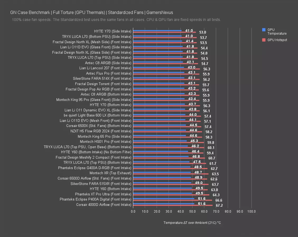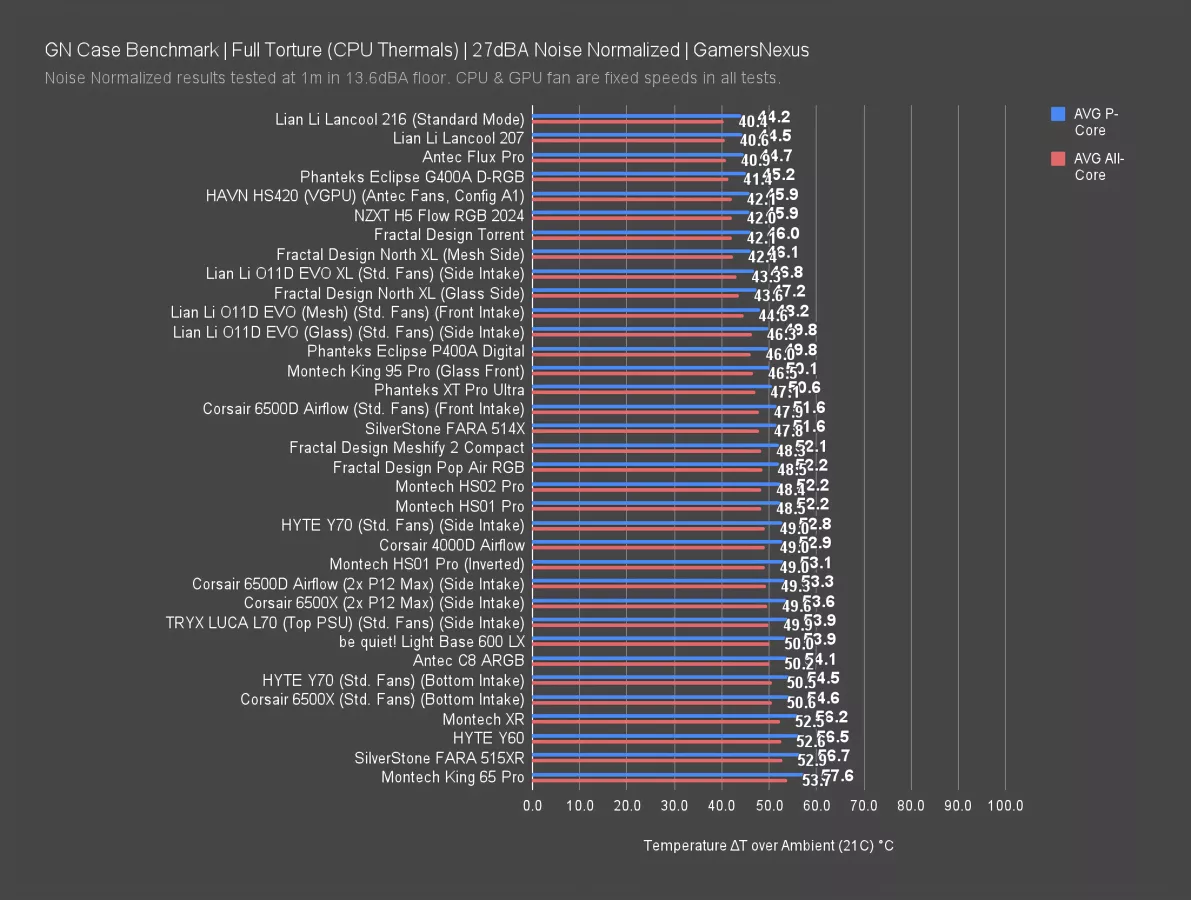 Although the different configurations didn't make much difference, the HS cases performed well overall for GPU thermals, respectably close to the C8 ARGB's 42 degree average. Like the C8, the HS cases have bottom intake fans that force cool air directly into and through the GPU and with minimal obstruction beyond a dust filter. The King 95 Pro also has bottom intake fans, but they're less effective, resulting in a 48 degree average. The Flux Pro and Lancool 207 remain leaders here, but one is in a different price class and both are different styles.