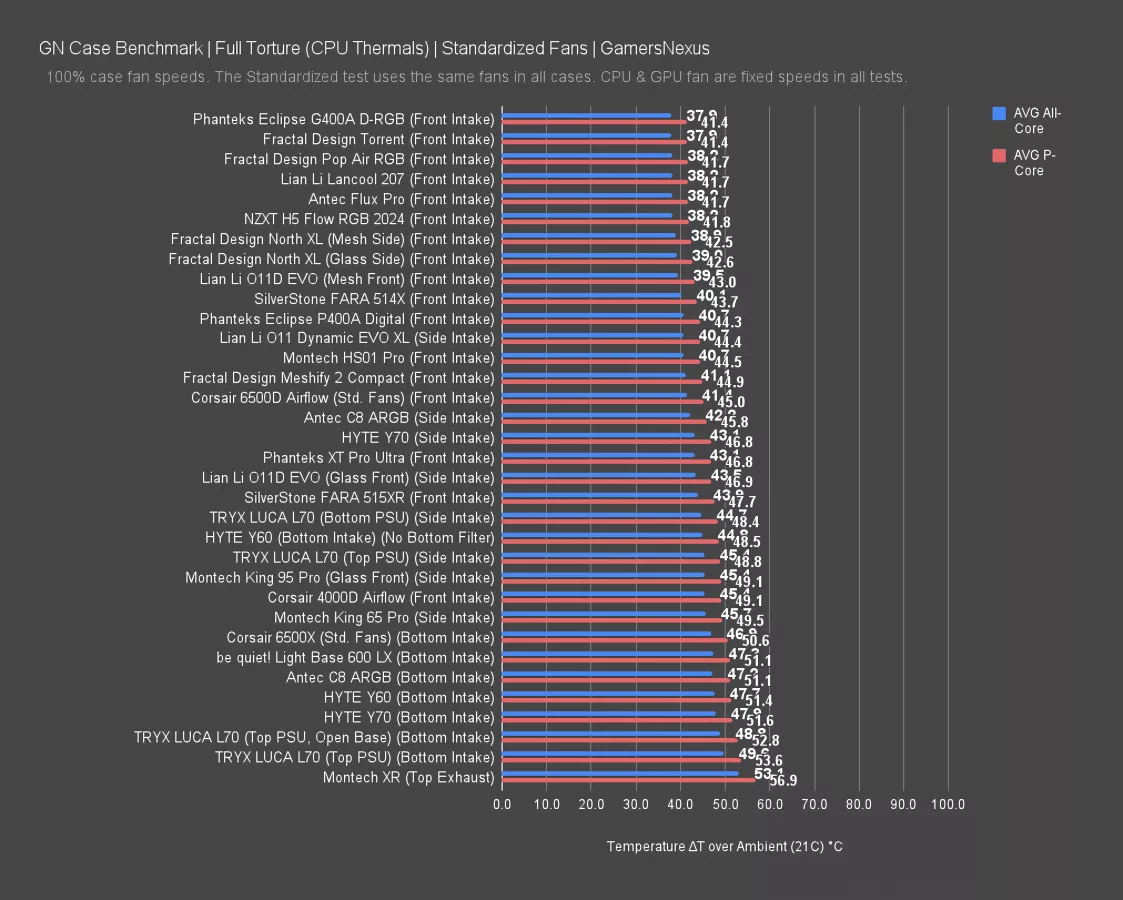 On the other hand, moving to the normal front-to-back layout with the standardized fans hurt GPU thermals. Removing the stock bottom intake fans that made the HS01 competitive in this category led to an average GPU temperature of 45 degrees above ambient, which isn't terrible, but allowed the King 95 Pro and C8 ARGB to take the lead at 43 degrees for both. Montech's stock fan layout seems like the best compromise.