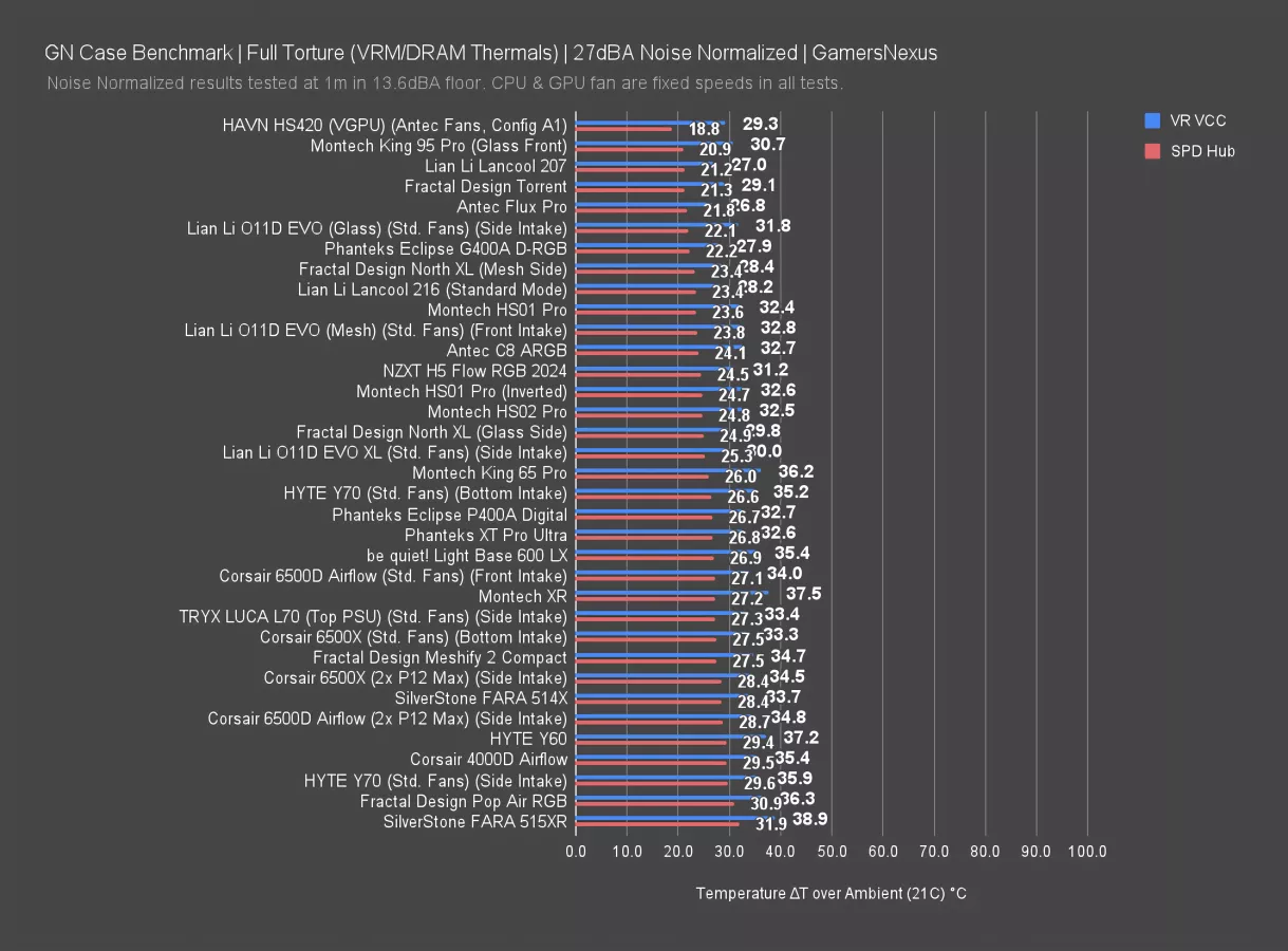 To finish things off, we'll move back to the noise normalized testing. VRM thermals were nearly identical for each of the three tested configurations, averaging 33 degrees above ambient in the HS02 Pro, which lands the HS cases in the middle of the chart between the C8 ARGB at 33 degrees and the King 95 Pro at 31.