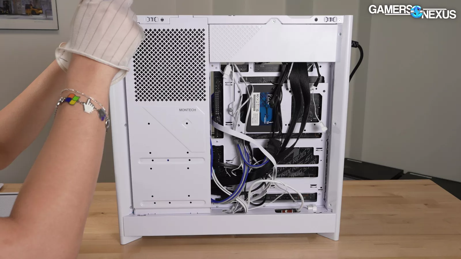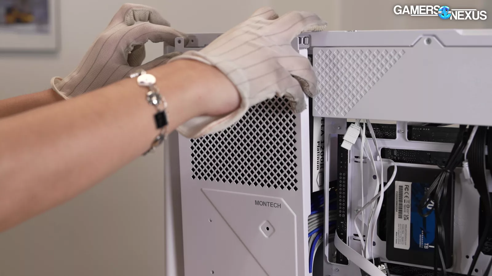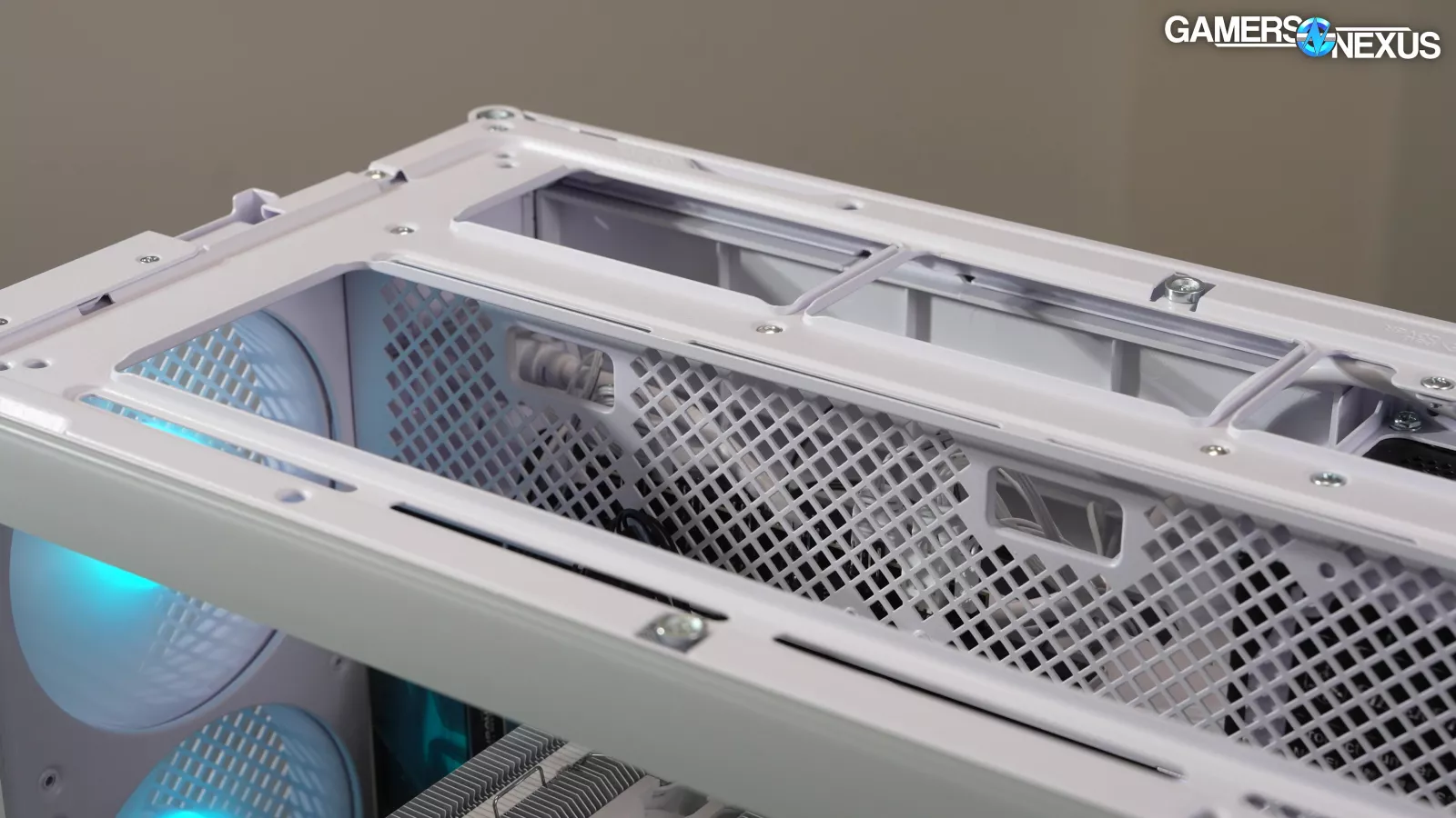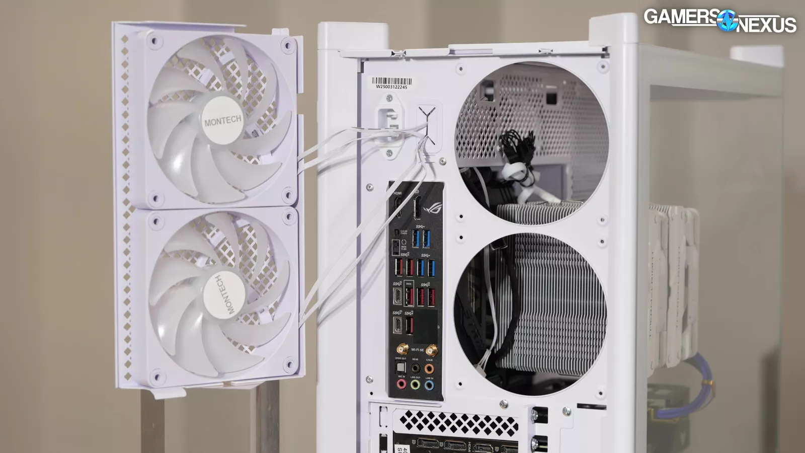 This is mostly an air cooling case, which is how we’re testing it. Radiator support is restricted, though. The front of the HS02 obviously doesn't support radiators since there are no mounts, but even in the HS01, the PSU placement overlaps with the front fan mount. That means there's only space for mounting on the outside of the chassis, and only normal 25mm thick fans fit (no radiators and no extra-thick fans). At the top of the case, Montech claims support for radiators up to 123mm wide, which is a strict limit due to the bumps on the ATX PSU bracket that pokes through, leaving small bumps to interfere with clearance. The bottom mount works fine for radiators other than obstructing the bottom edge of ATX boards, but Montech (correctly) doesn't claim compatibility above 240mm due to the cramped space. There's no 140mm-wide radiator compatibility in either case, and only the HS01 has support for any 140mm fans.