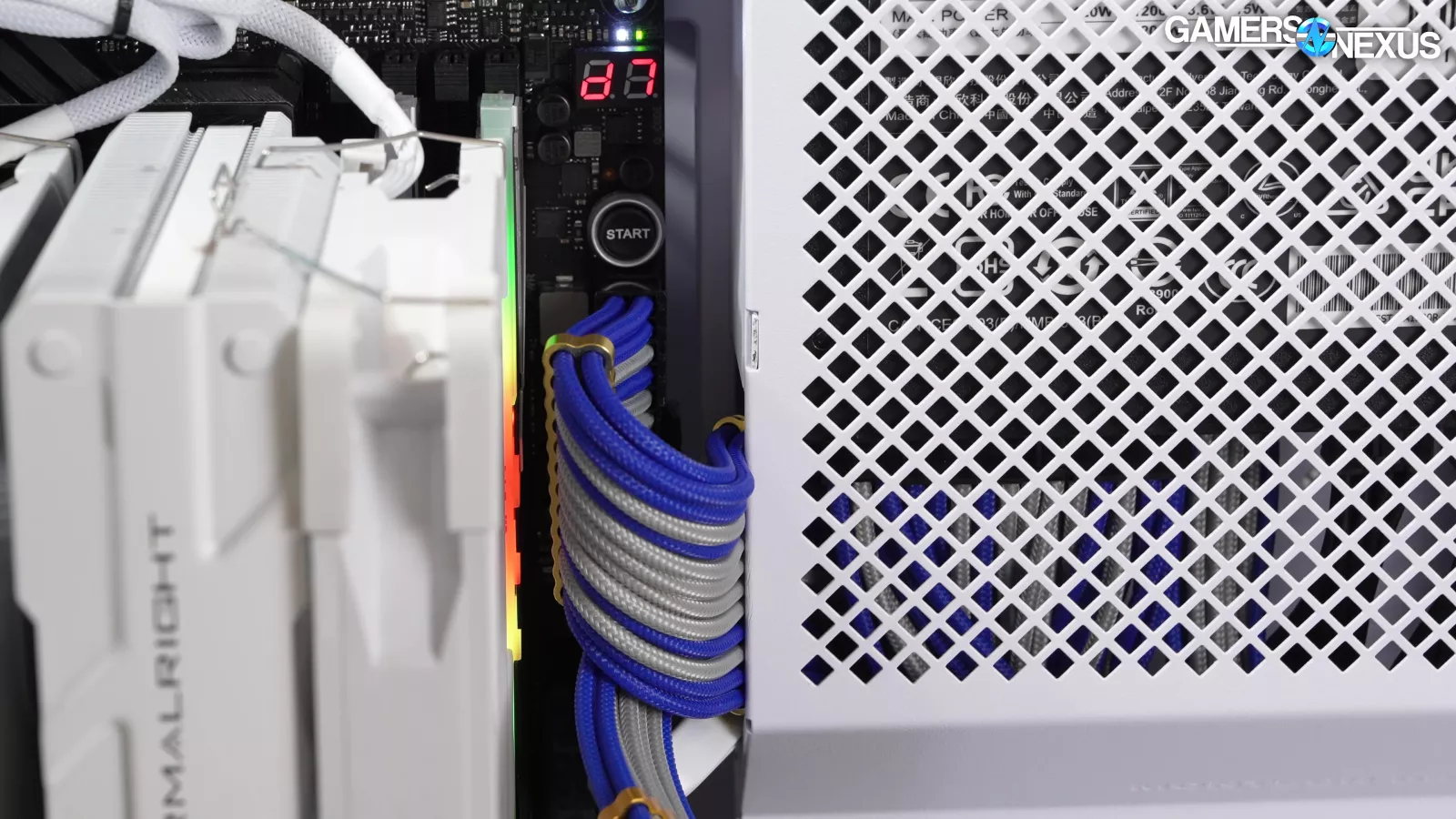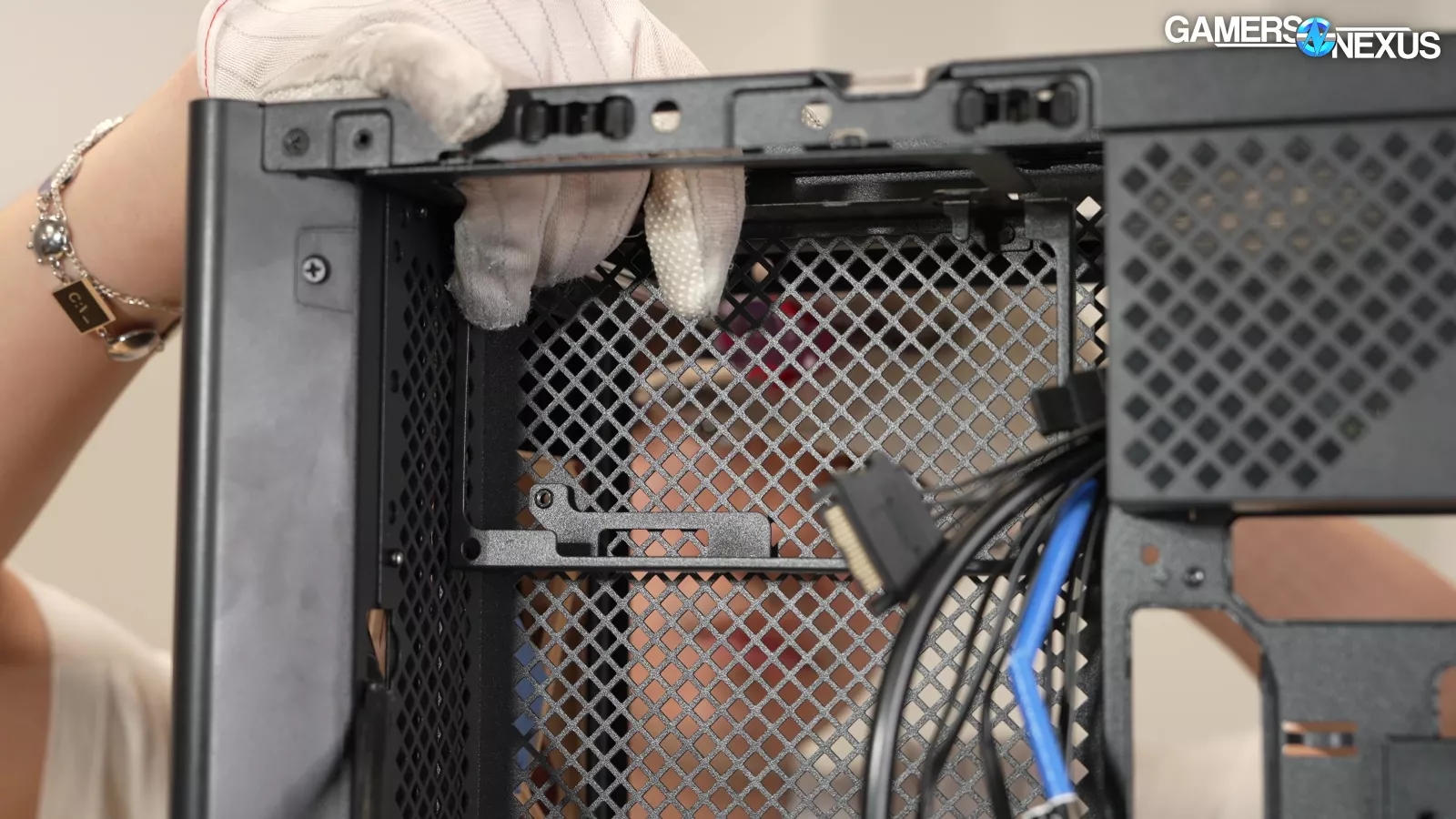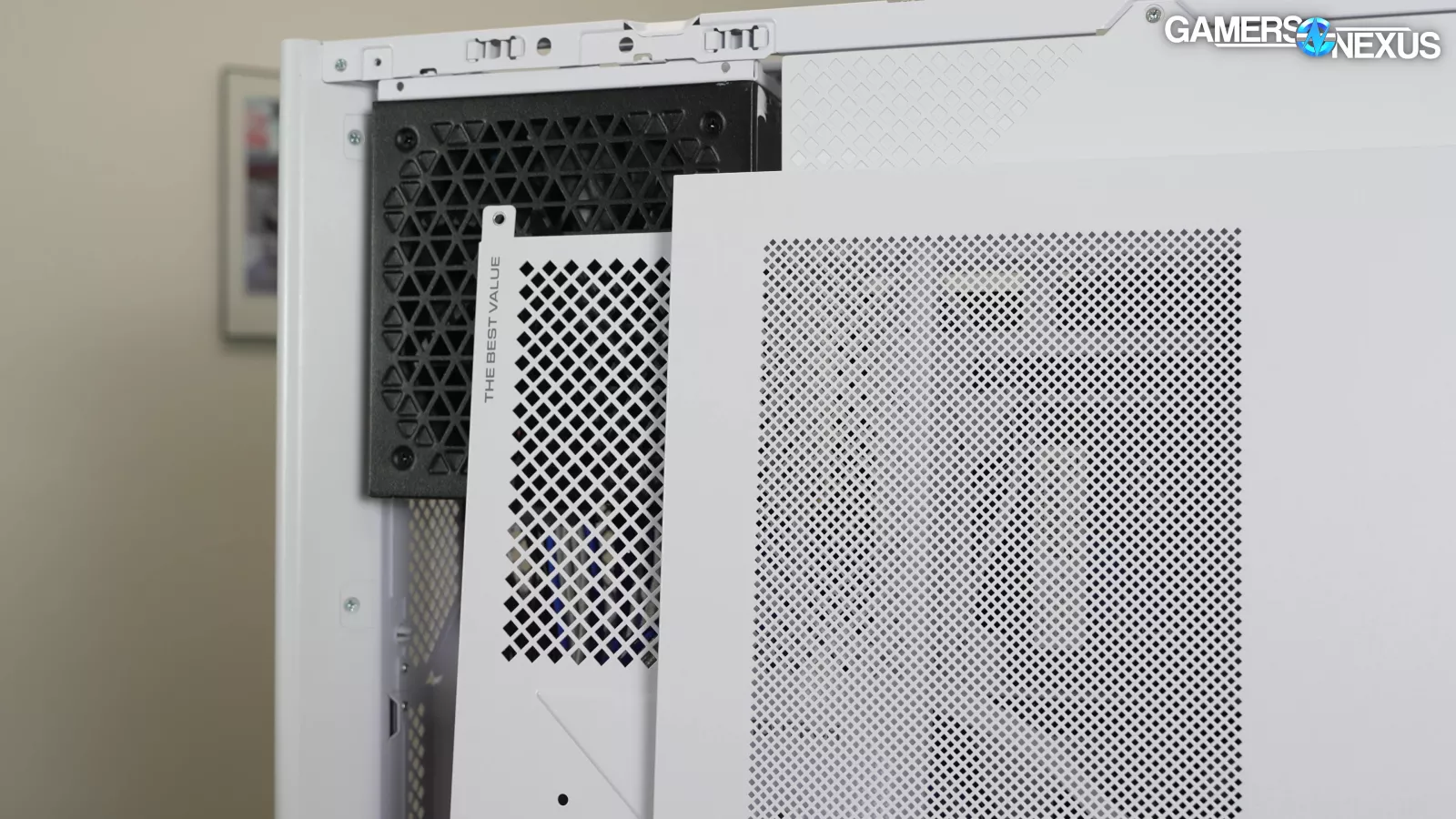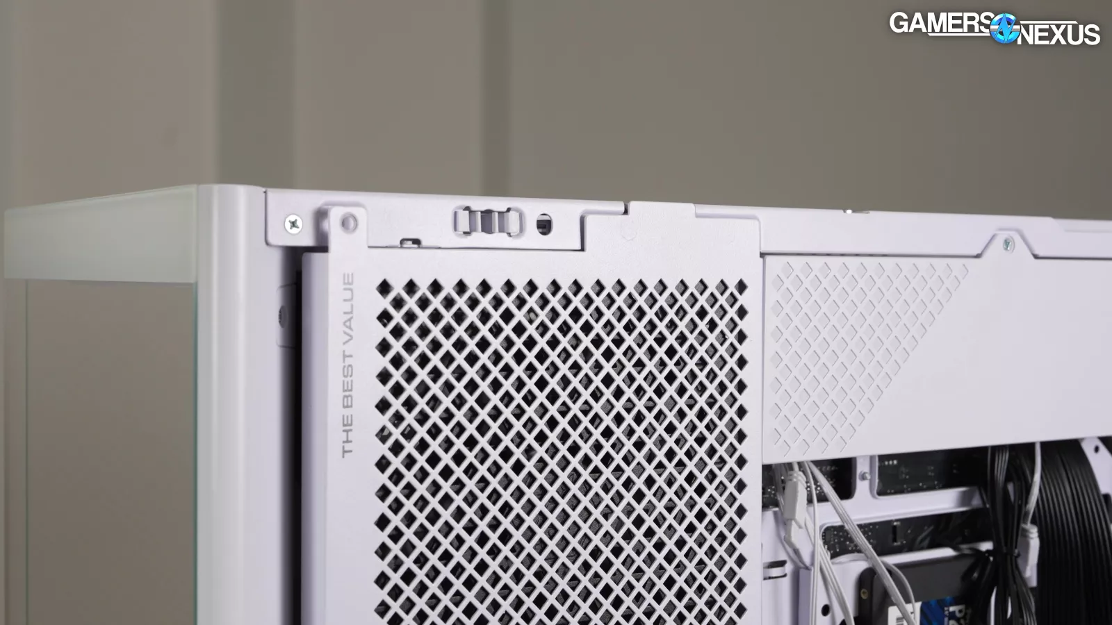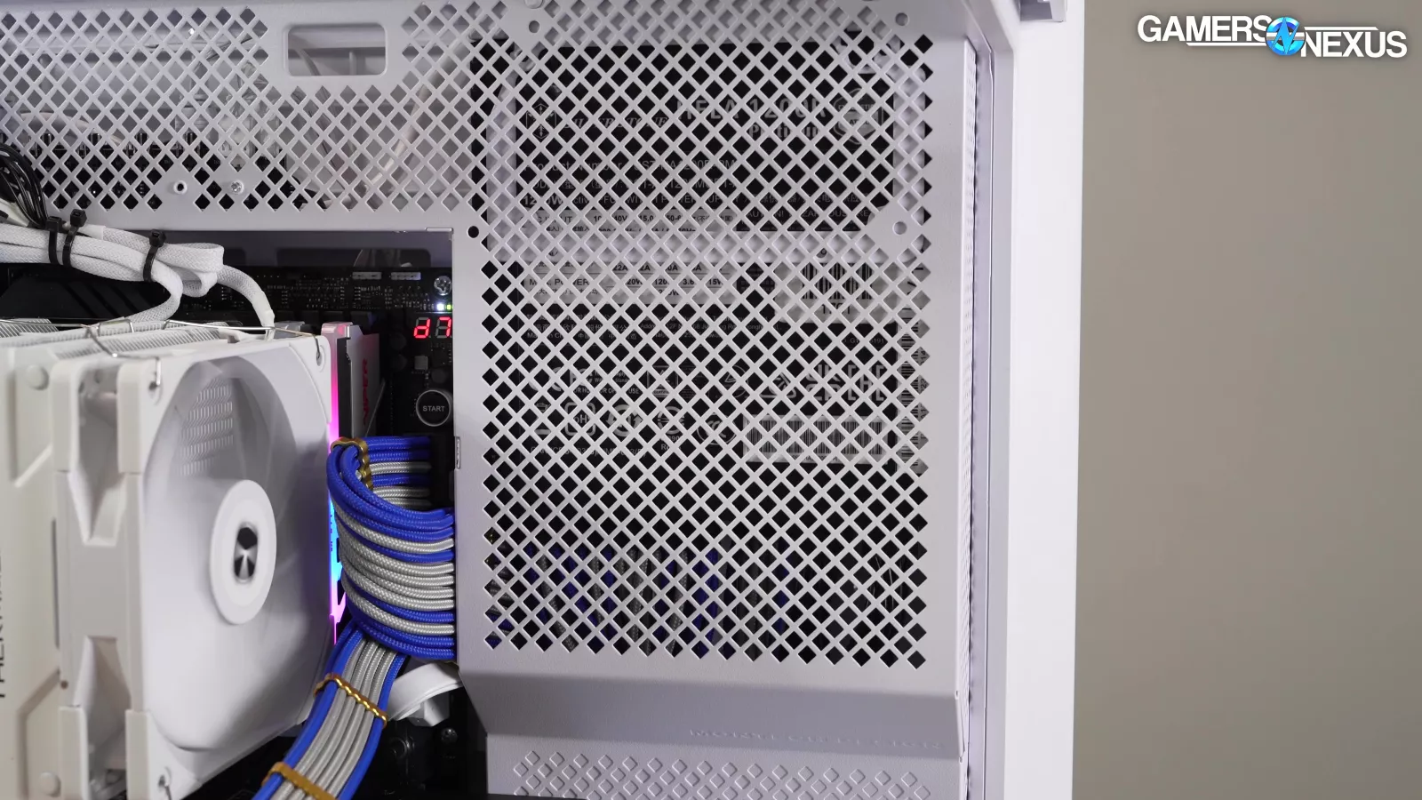 The PSU area leaves a lot to be desired: Unfortunately, we end up with 3 layers of blockages from the PSU case mesh, the interior cover door mesh, and the exterior panel mesh. The two case panels overlap and obstruct each other, which already overlap with the PSU ventilation. Stacking 3 layers atop each other reduces flow and increases resistance, which can increase noise or minimally reduce cooling. Fortunately, PSUs tend to be less thermally sensitive, but we’d like to see fewer overlapping obstructions.