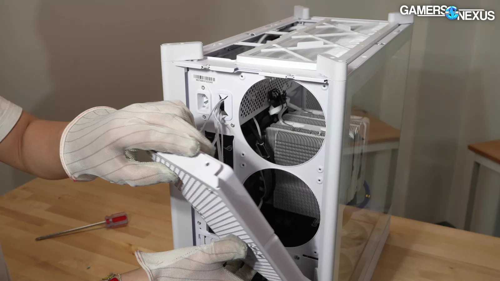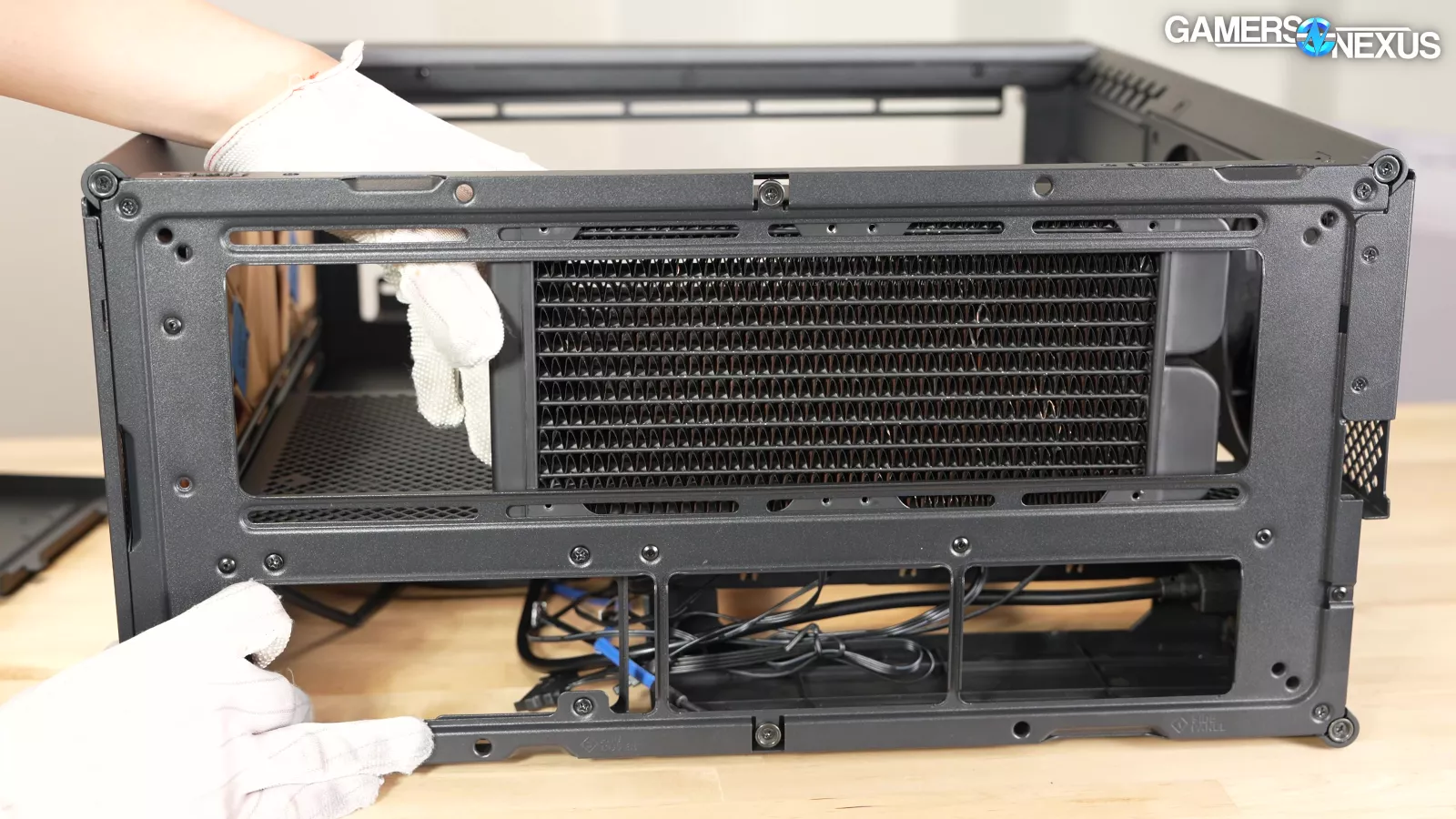 Major points of interest include the recessed motherboard tray, ventilated rear chamber cover, and abnormal power supply location up in the front. It’s not all good news, however. The power-supply area has some ventilation problems we’re not happy about, but there are some mechanical upsides.
