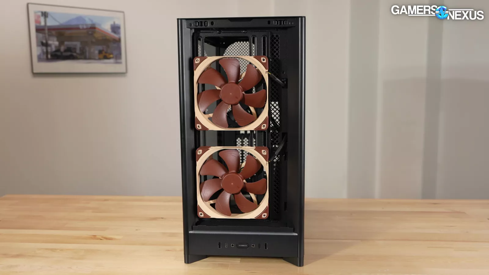 Our standardized set of fans can't be installed in the HS02 due to the lack of 140mm mounts, which made this test simple. We installed the two 140mm intake fans at the front of the HS01 and the single 120mm exhaust in the lower of the two rear slots.