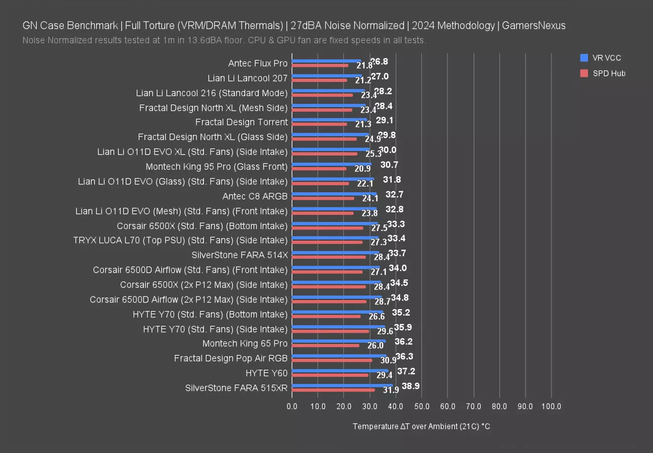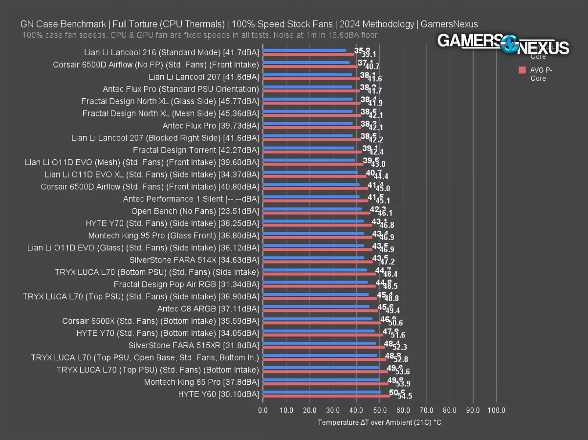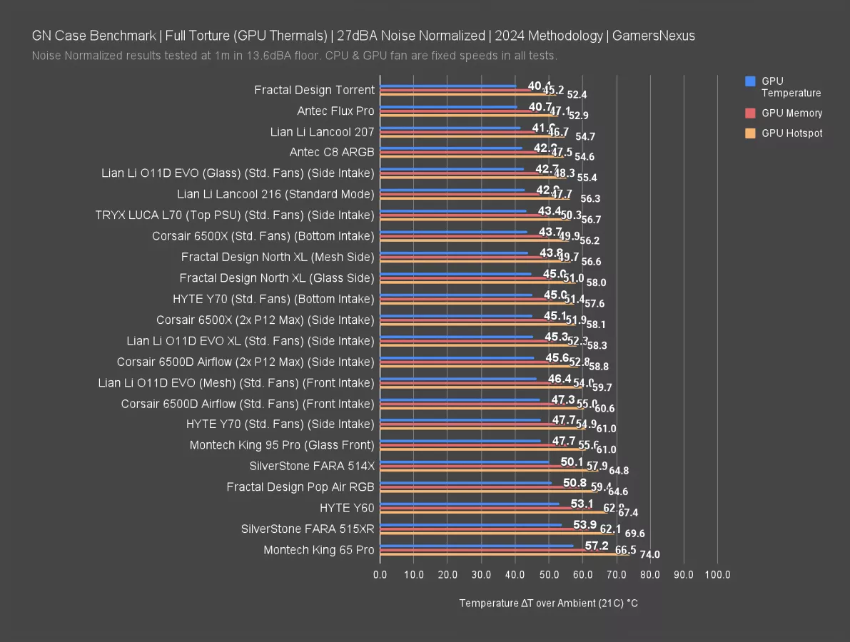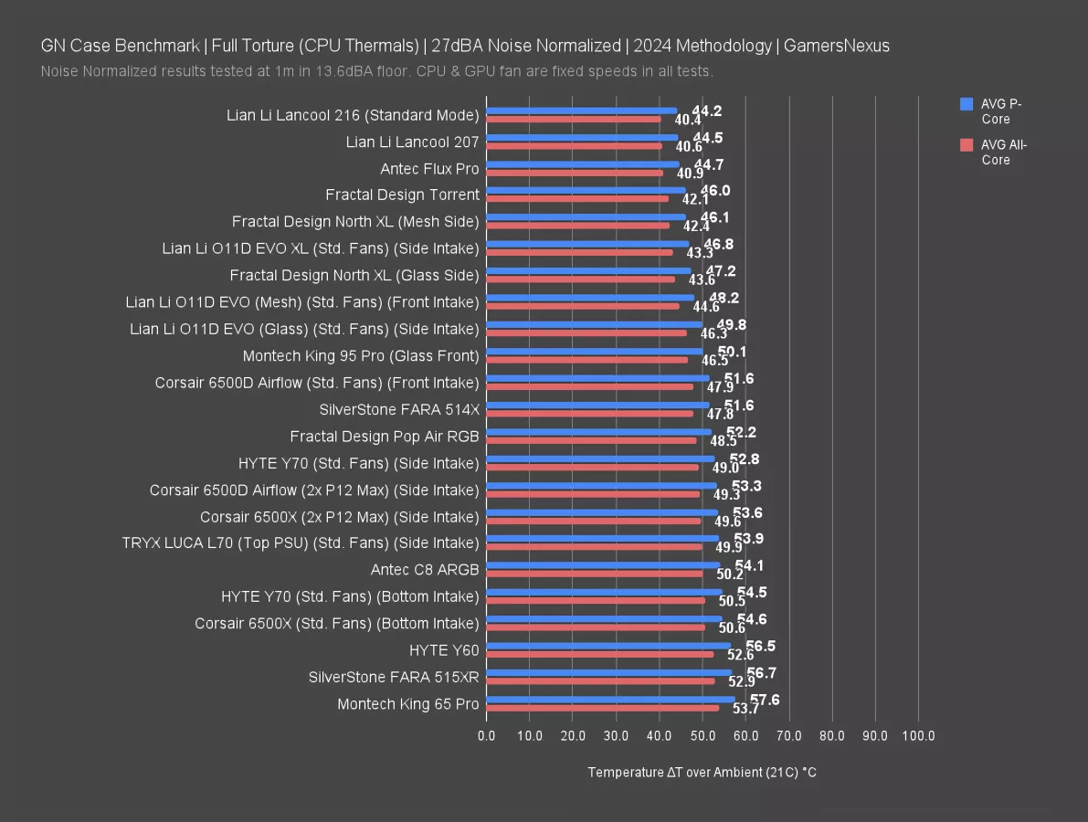 The $150 Antec C8 (read our review) is an impressive 15 degrees better than the King 65 Pro. The $80 Lancool 207 is also about 15-16 degrees better than the $100 King 65 Pro.