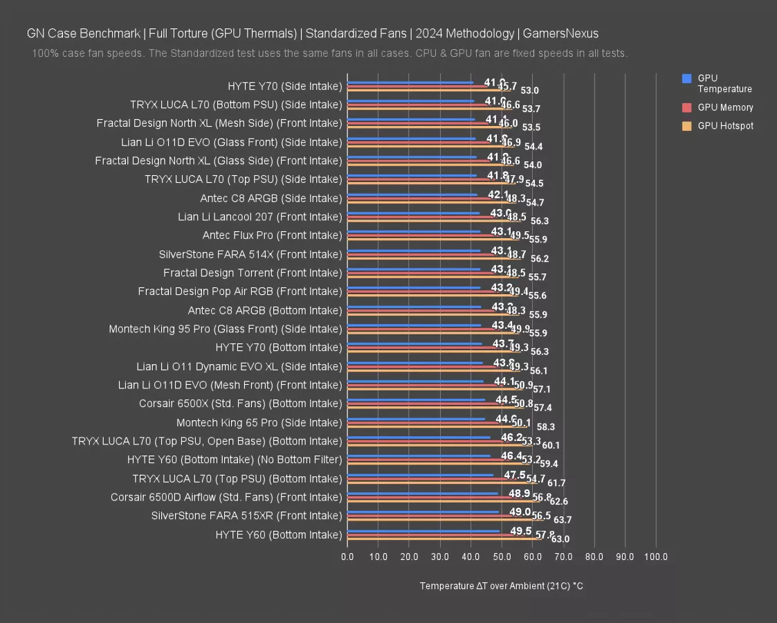 The Antec C8 with comparable side intake lands at 46 degrees, outperforming the King 65 and King 95 alike. Because we’ve normalized to the same fans and in the same positions, we can confidently state that the King 65 and King 95 have paneling that obstructs the fans enough to worsen performance. Montech could boost itself by changing its porosity and all the small obstructions to airflow that add up, like those earlier rails we discussed.