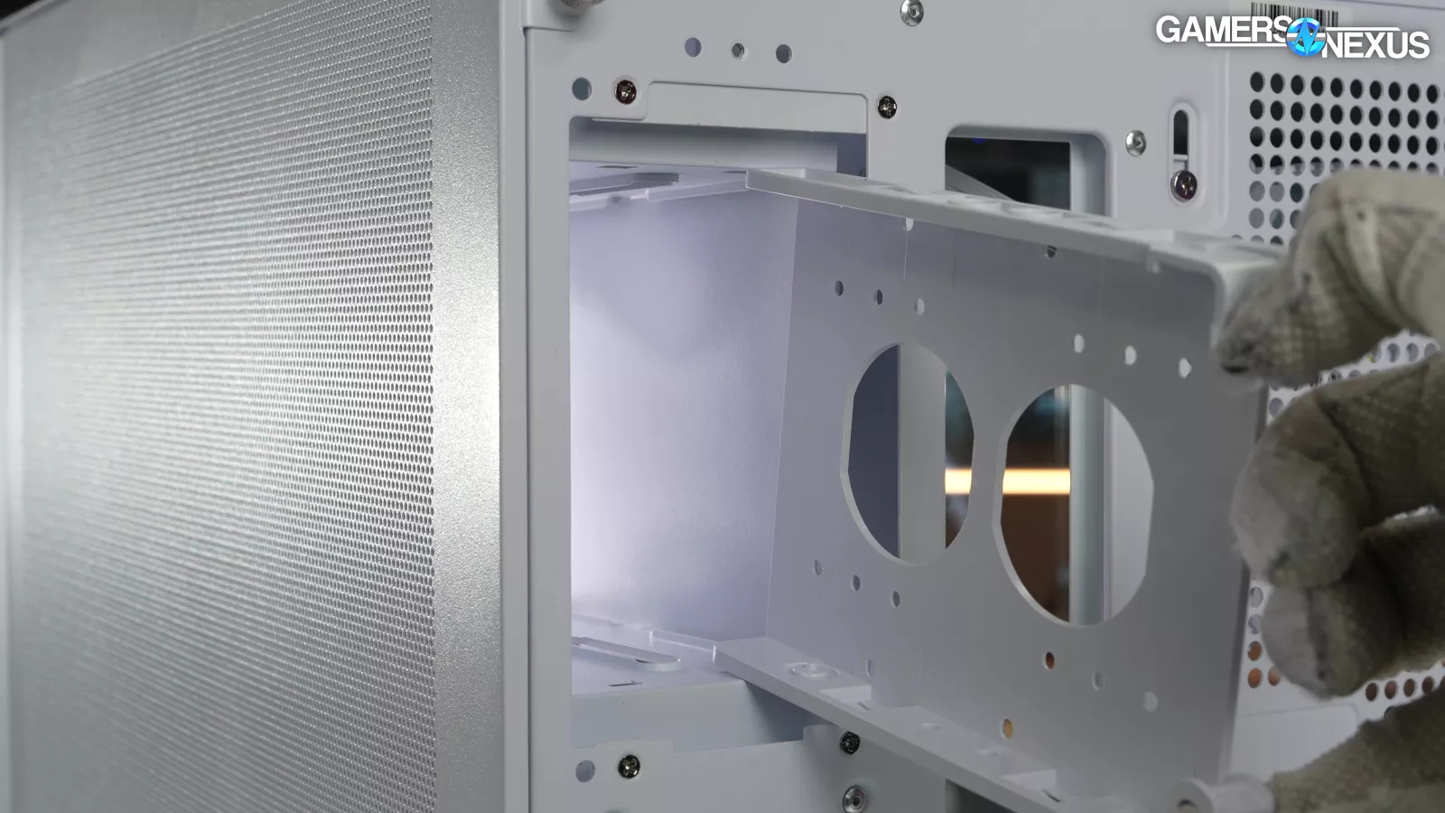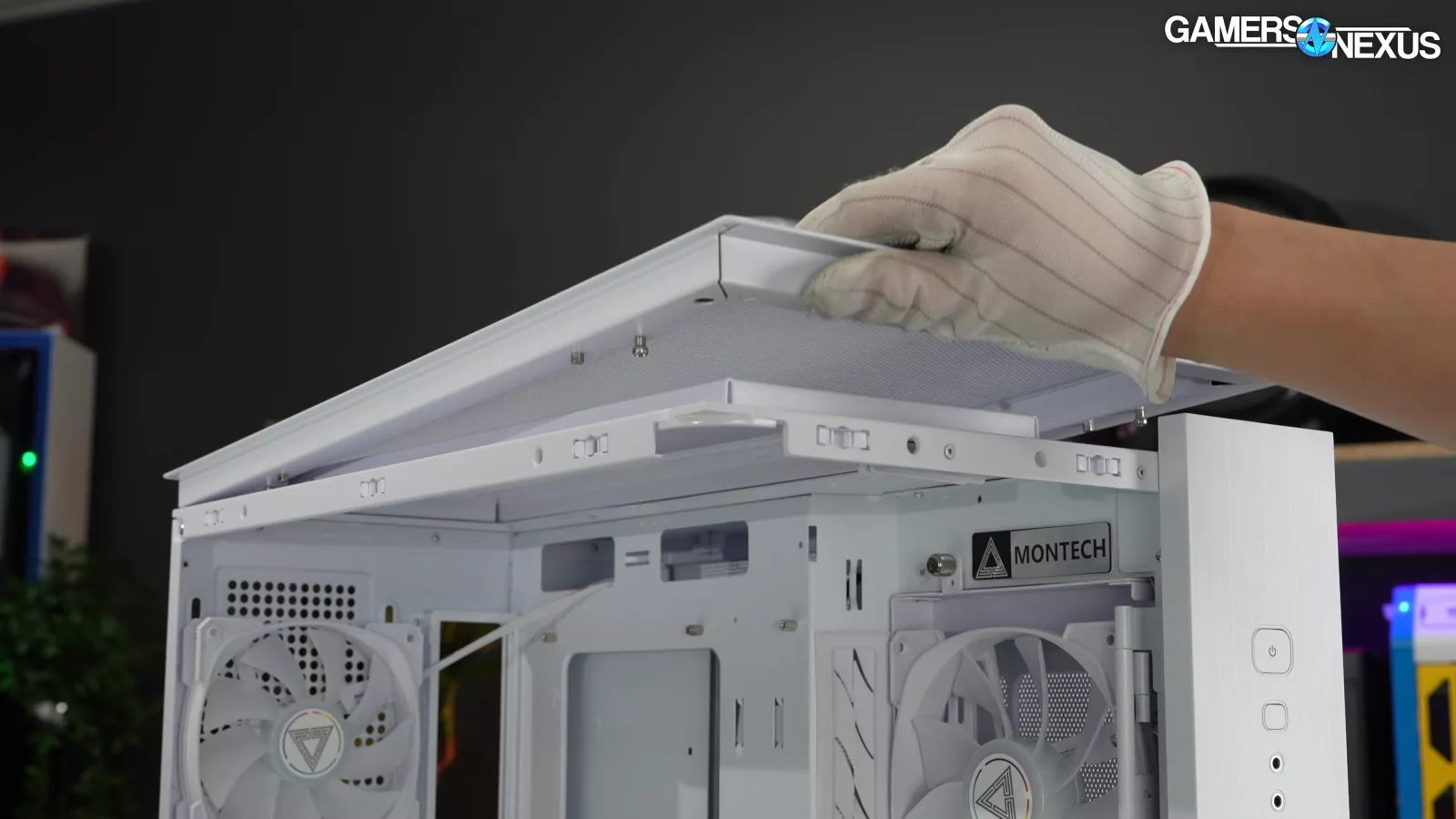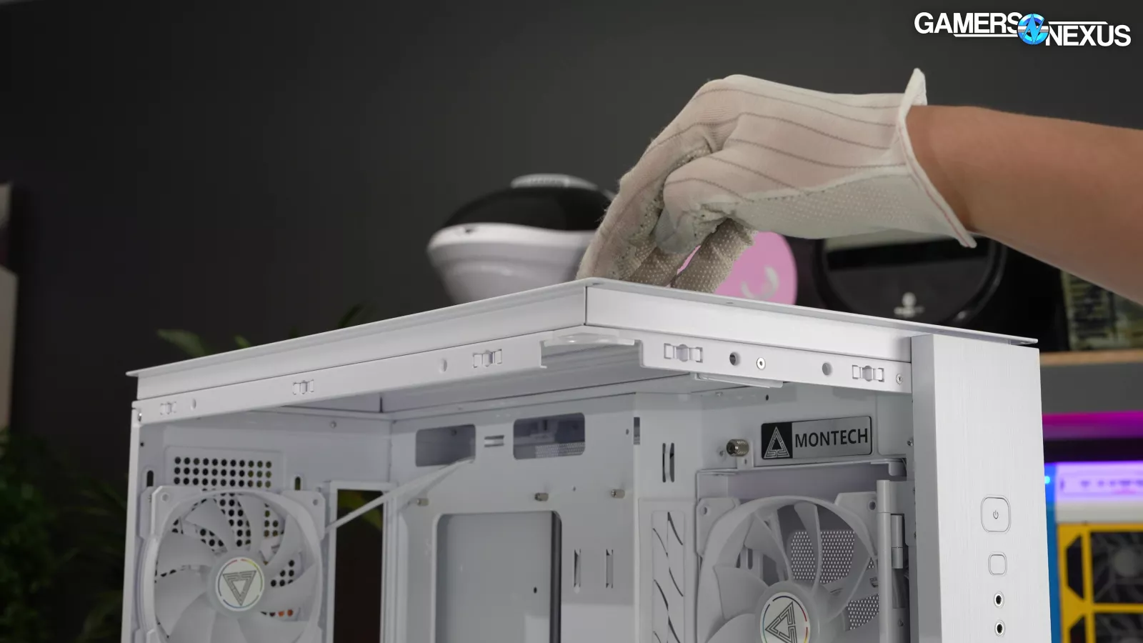 Both sets of fan mounts have heavy obstructions. By accommodating both 120mm and 140mm sizes, Montech needs two sets of mounting points. Unfortunately, in the process of creating these, it has covered up to about 20mm per side of the fan blade, or 40mm total horizontally obstructed. This is a huge amount of intake area loss. Montech could still support two sets of rails, but at least cutting a hole right in the middle would be better -- or even running the rails the entire length of the fan so that there’s some room for air. This is an oversight that likewise extends to the King 95. The King 95 Pro did OK in most of our tests, but falls behind other cases with similar fan count. This is a large contributor to that.