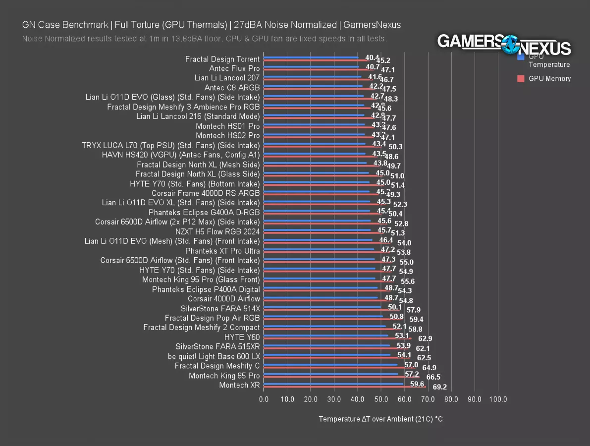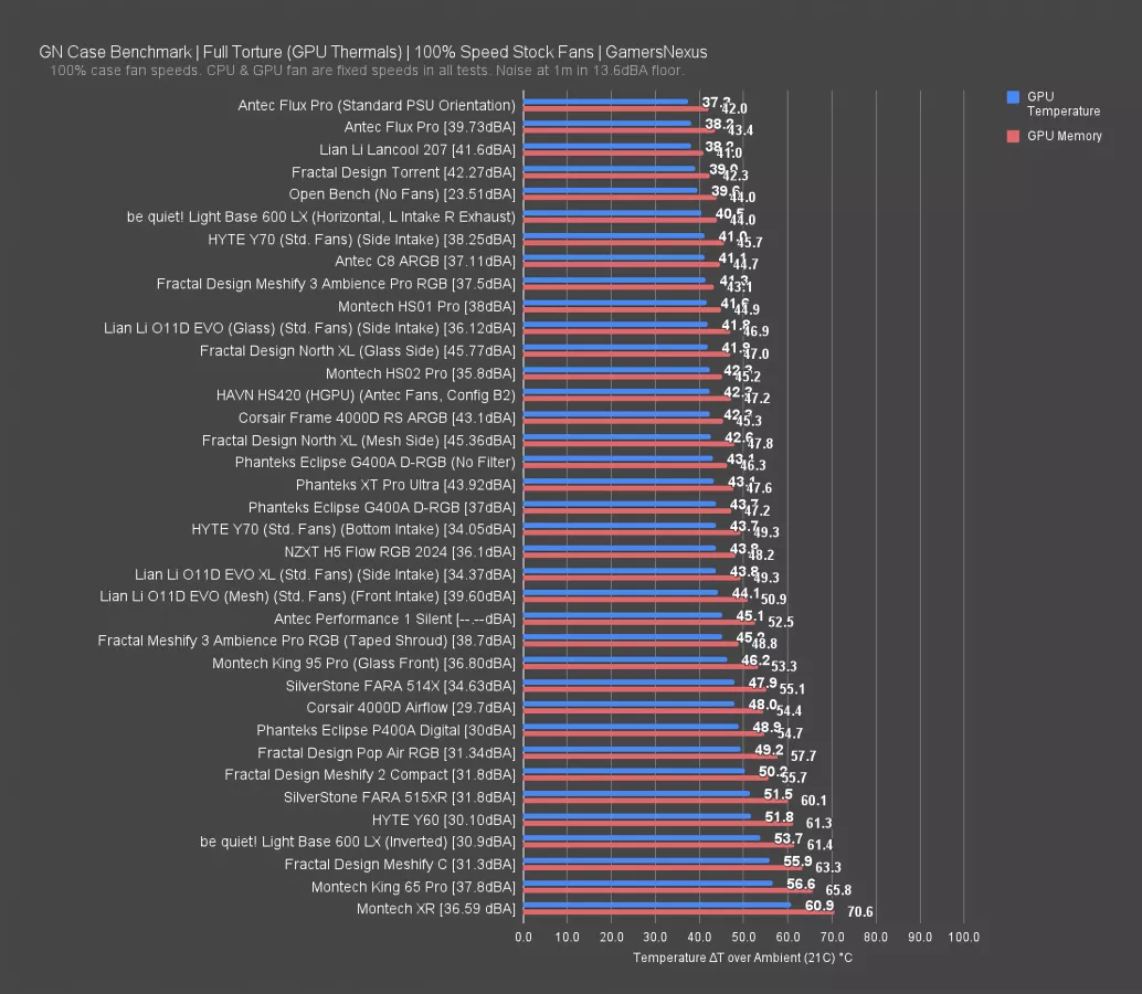 The C8 ARGB tied the Meshify 3's GPU temperature in this test, which is impressive for the Meshify 3 given that the C8 ARGB has bottom intake fans pointed directly into the GPU. The stock Flux Pro and Torrent remain chart toppers at 38 degrees and 39 degrees respectively thanks to their overkill stock fans; this is also evident from the noise levels, with the Torrent's powerful fans pushing it to a maximum of 42.3 dBA to the stock Meshify 3's 37.5 dBA.