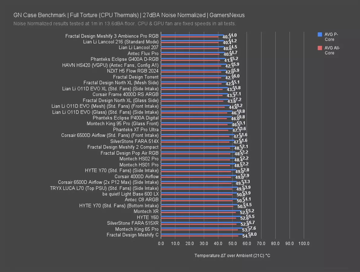 This is the chart. The Fractal Meshify 3 dominates here, planting itself as the new chart leader and within error of the prior leaders. The Meshify 3's all-core average of 40 degrees Celsius over ambient and 44 degrees for the P-cores is significantly better than previous efforts from the Meshify 2 Compact (watch our review) at 48 degrees average and the Meshify C at 54. Those two cases shared a basic design. The Meshify 3 is more of a departure; Fractal has added an airflow guide to the bottom of the case, the stock fans are higher performance, and all three stock fans are installed in the front of the case.