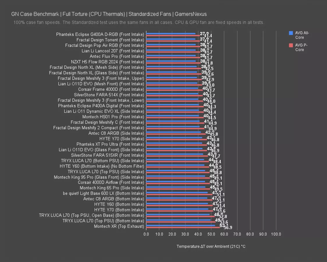 As for the other highlighted competitors, the Antec C8 ARGB averaged 42 degrees and the Flux Pro averaged 41. Technically they both beat the Meshify 3's 43 degree average, but they're all among the best performing results on this chart.