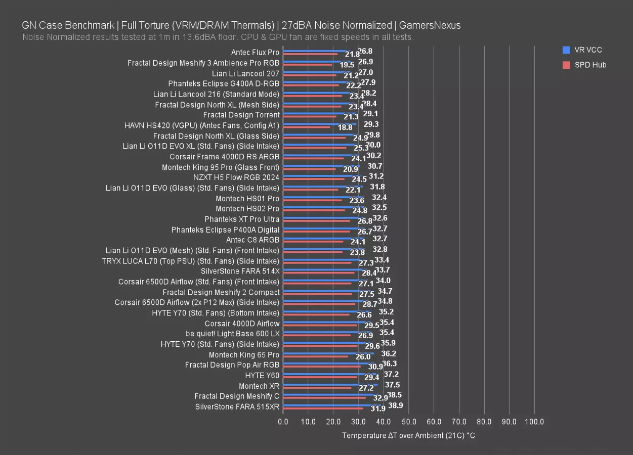 Returning to the noise-normalized results, the Meshify 3 tied the Flux Pro for the best VRM temperature on the chart at 27 degrees above ambient. That's significantly better than its predecessors at 35 degrees for the Meshify 2 Compact and 39 for the Meshify C. The Torrent averaged 29 degrees and the C8 ARGB with its bottom intake layout averaged 33. The ventilated case roof and airflow definitely help here.