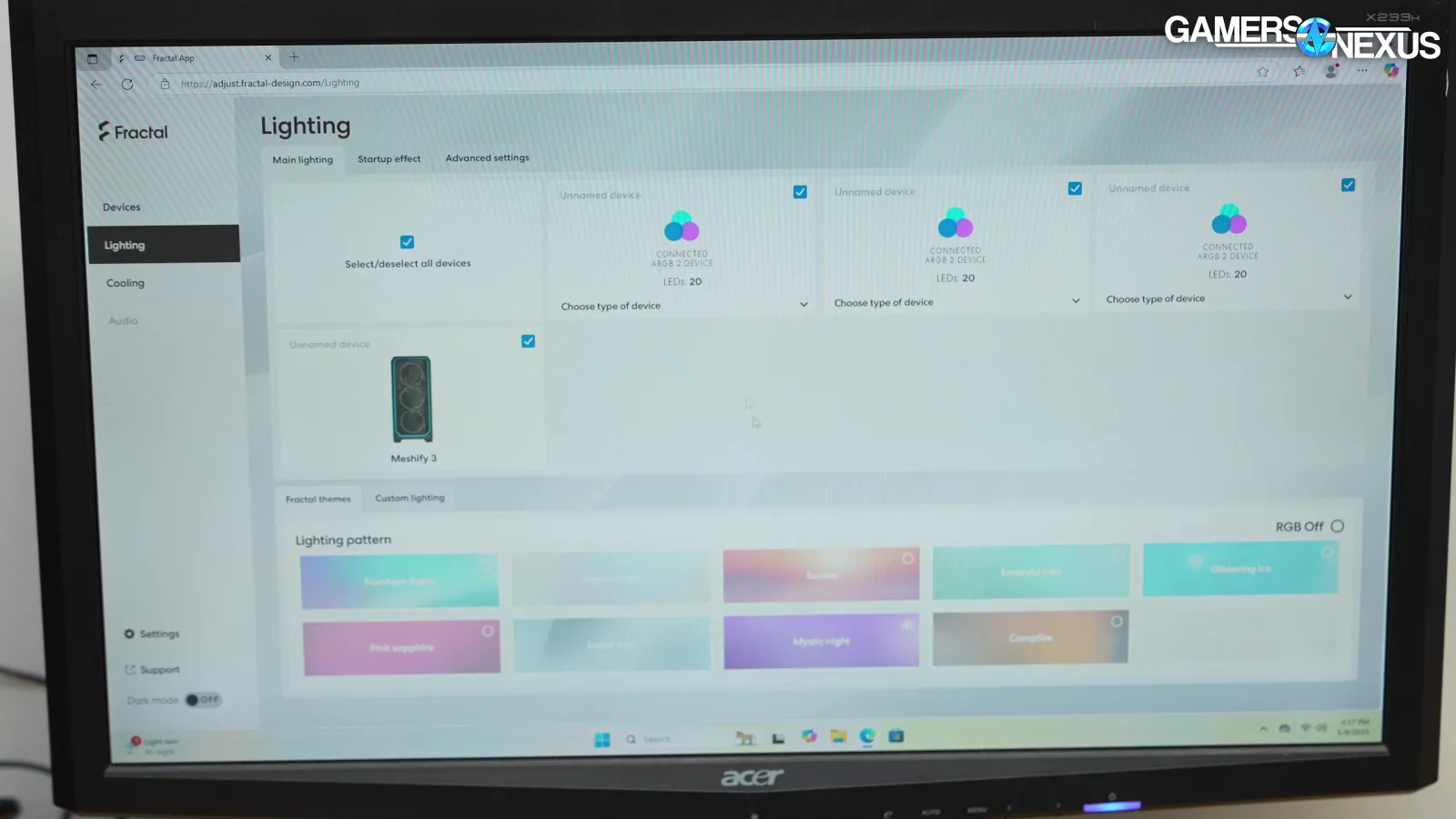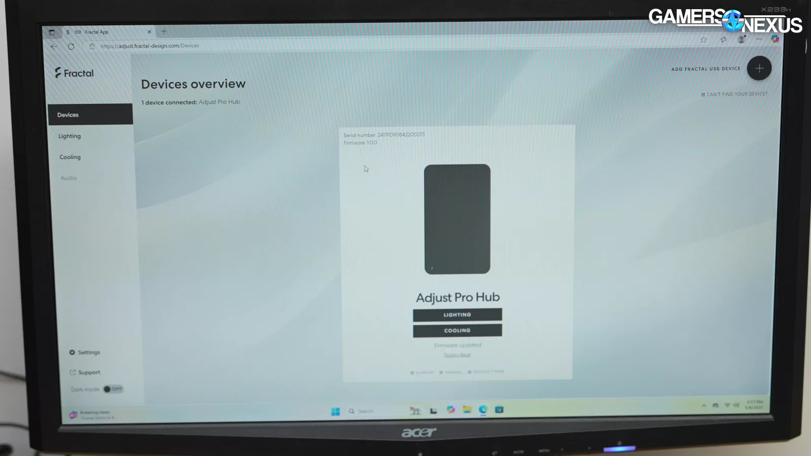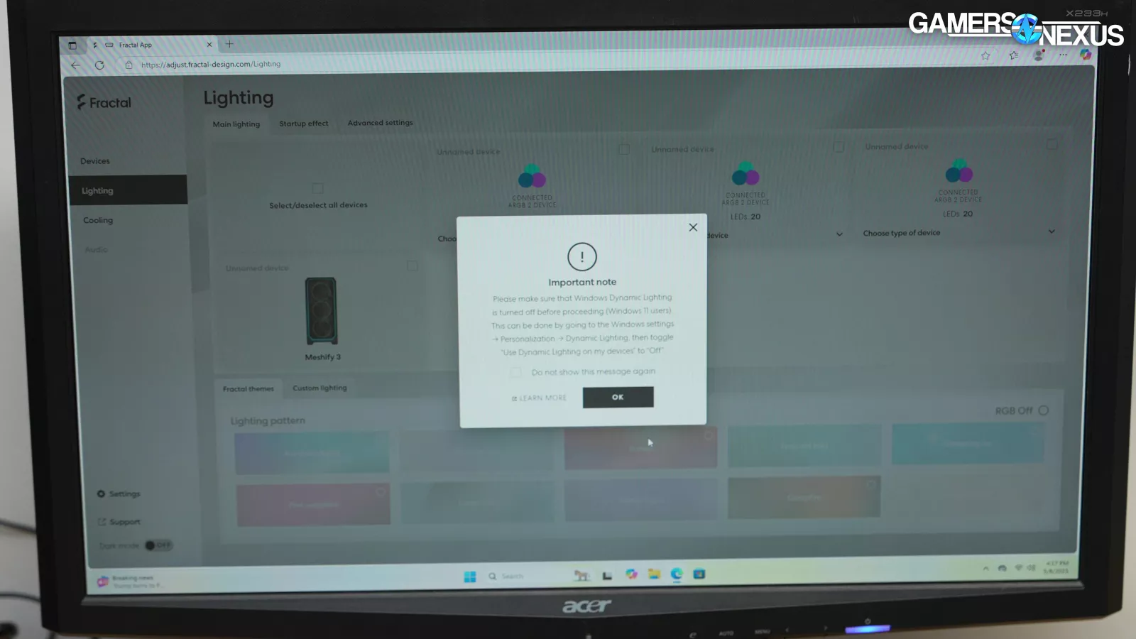 The Adjust Pro Hub can be controlled through a web tool or Microsoft's Dynamic Lighting feature. Fractal can get away with using a simple web app because the Pro Hub is just a USB device, so it doesn't need low-level access to control the motherboard's fan and RGB headers. There’s no launch-on-startup bloatware and the settings are saved locally to the hub. Currently, the app claims to be fully compatible with Chrome, Opera, and Edge (but not Firefox). A sustained internet connection isn't required for this. We were glad to see Dynamic Lighting compatibility, even if it's not perfect. For instance, if you enable Dynamic Lighting, it breaks Fractal's tool, and if you haven't activated Windows then you can't disable Dynamic Lighting without editing the registry.