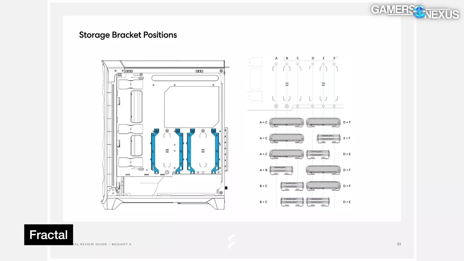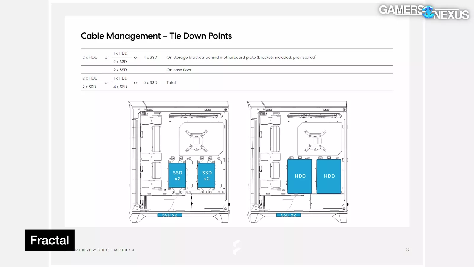 Drives can be mounted to a set of adjustable brackets behind the motherboard tray; Fractal has provided a complicated compatibility matrix, but basically, you can either fit up to 2x 3.5" drives or 4x 2.5" drives. An additional 2x 2.5" drives can be attached directly to the floor of the case underneath the air guide, but if you use those slots, you may want to leave the air guide out to make cables accessible.