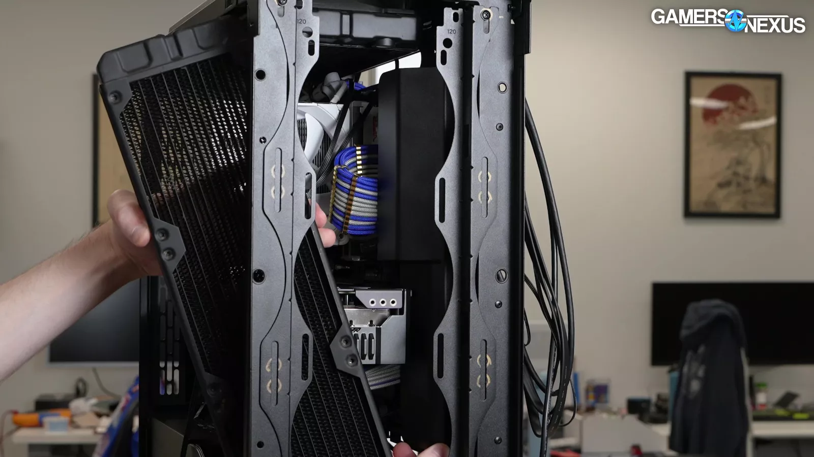 It reminds us a little of the NZXT toilet bowl fan from the 2022 H5 Flow (watch our review), but more so the extremely similar "PSU optional cover plate" from Corsair's old 5000D Airflow (watch our review). The 5000D Airflow's single intake fan wasn't positioned to make that part matter, though, whereas the Meshify 3's intake-heavy configuration will actually benefit.