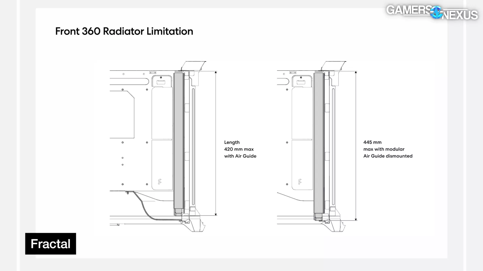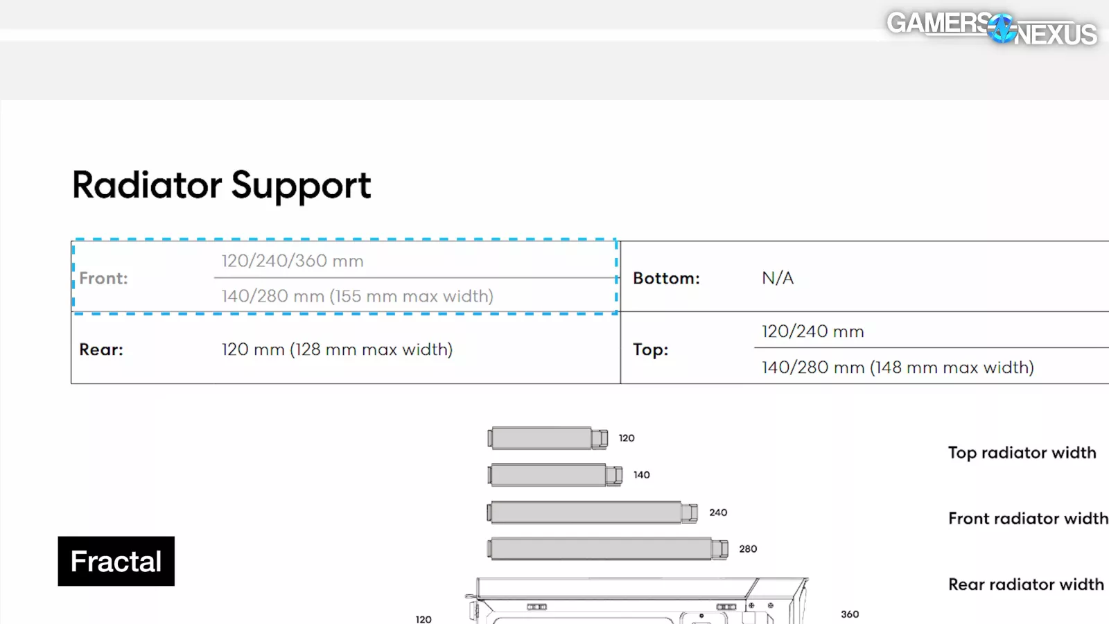 The removable top bracket is extremely easy to work with and fits radiators up to 280mm with plenty of room. Simultaneously installing a 360mm radiator at the front of the case would technically be possible using standard 30mm thick rads, but without much room left for fittings, fans, or thicker radiators, so we don't recommend it. Fractal notes that the front mount is compatible with 360mm (3x120) radiators of up to 420mm total length with the air guide or 445mm without it. Critically though, this does not mean support for 420mm (3x140) radiators.