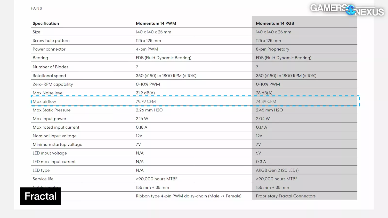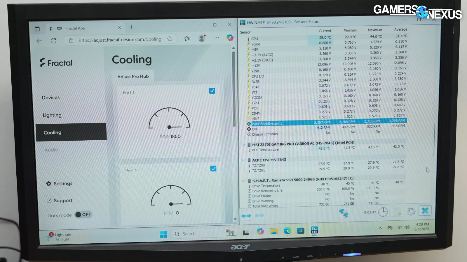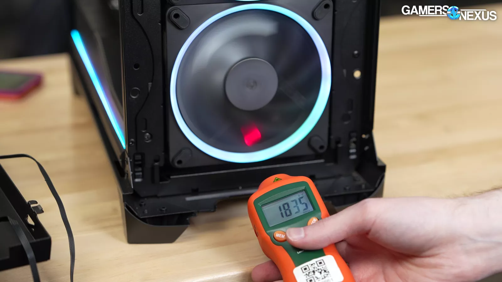 For reasons we’ll explain in the fan control section, we had no way to skip the fan hub and connect the fans directly to the motherboard as we usually would for testing. We validated that the fans reached their rated max speed of 1,800RPM +/- 10% with a laser tachometer. However, the tach signal sent back by the Fractal Adjust Pro hub doesn't line up with standard 4-pole fan behavior: HWiNFO misreports 2295 RPM when the fans are really spinning at just over 1,800 RPM in reality. Fractal's software accounts for this and reports RPM accurately.