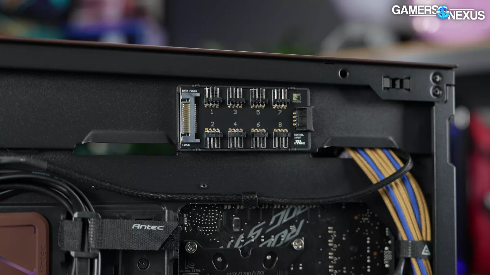 The included fan kit includes fan screws and the NA-AV4 "anti-vibration mounts" that serve as silicone sticks that substitute for screws. The included fan hub is magnetic for easy movement anywhere in the case, takes SATA power and PWM input, has eight channels, and is pre-wired with extensions to reach the suggested fan mounts. The hub is a well-equipped fan hub that Noctua already sells. Eight outputs is an improvement versus the original Antec option, which only had five outputs for six fans.