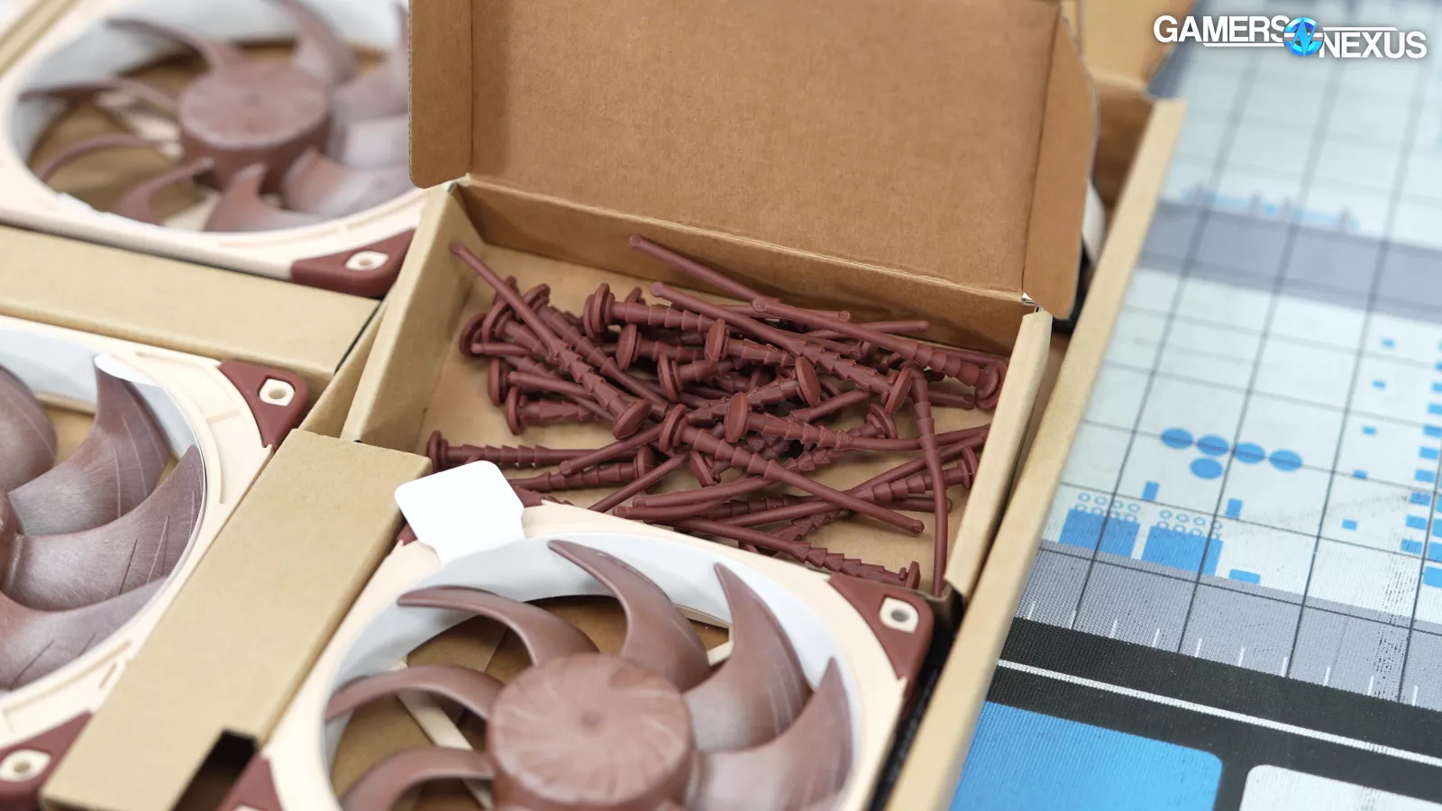 We started out by installing fans in the same locations as the Antec Flux Pro to provide a direct A/B comparison. We installed the fans in the ABABAB alternating pattern for RPM offsets of the A12 G2 and A14 G2 series, per the manual, to test the marketing claims. Also following the manual like a real end user would, we swapped the fan screws for the recommended NA-AV4 anti-vibration mounts. We also did a test configuration with the screws instead, without the guided ABABAB tuning for the fans (meaning randomly mixing the fans), and with cable management messier.