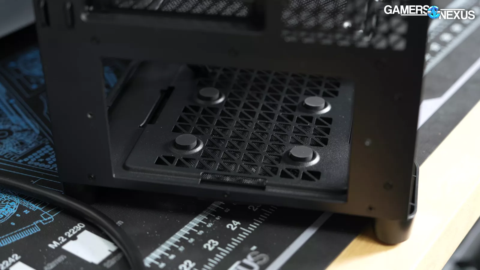 Finally, the rubber pads for supporting the PSU had fallen off in shipping in our original Flux Pro, and it happened again in the Noctua Edition. If you order a Flux Pro, check inside the shroud to make sure all four rubber circles are still stuck on. Given that this has now happened to us twice on known review units, we have to assume this is an Antec manufacturing issue -- such as with the adhesive choice or with the curing time for it. It’s a small and mostly irrelevant point, but on a case this expensive, they had plenty of time to fix a known issue.