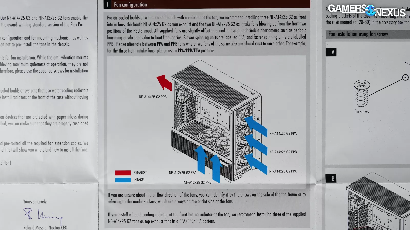 That's fair enough, and it also means that it’s cheaper for them by reducing assembly time, but the manual still recommends installing the fans in the same locations as the stock Flux Pro. Because that’s the most likely configuration for users to follow and to have a better A/B, we tested that one with one alternative.
