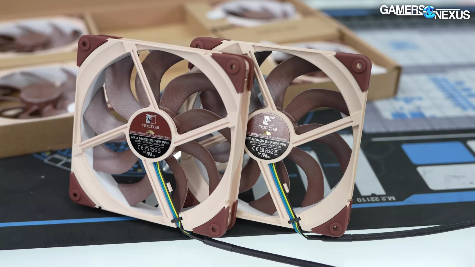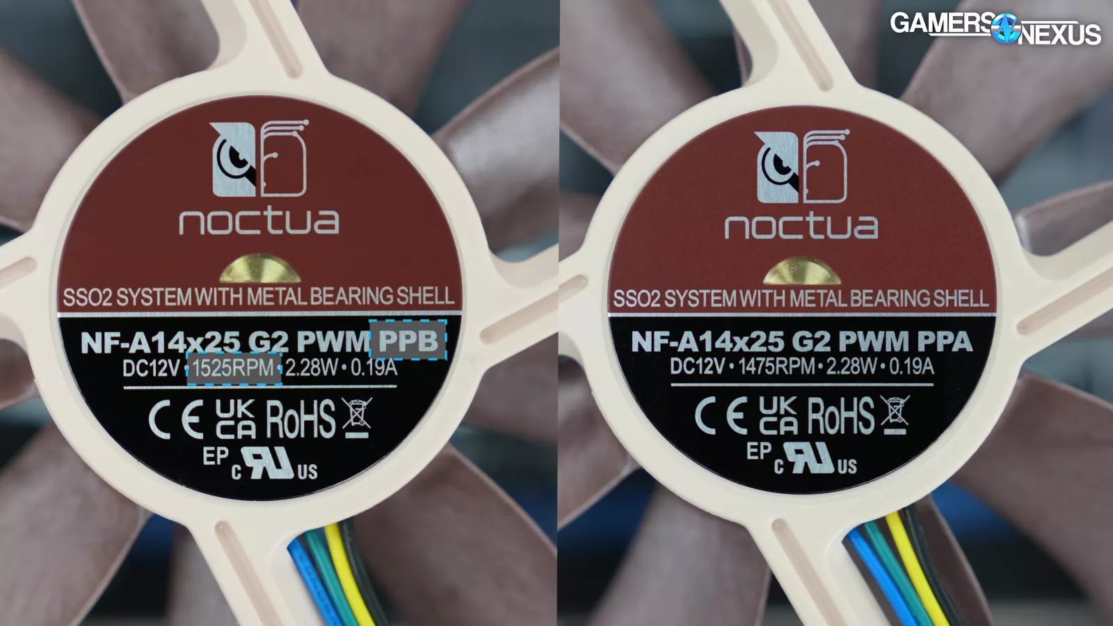 The fans are slightly faster (labeled "PPB") and slower (labeled "PPA"), with the objective being to reduce or avoid the beat frequency phenomenon. We've covered this concept with Noctua's Jakob Dellinger before, including a technical break-down of the RPM offset and its impact on acoustics. You can also read our NH-D15 G2 review for more depth.