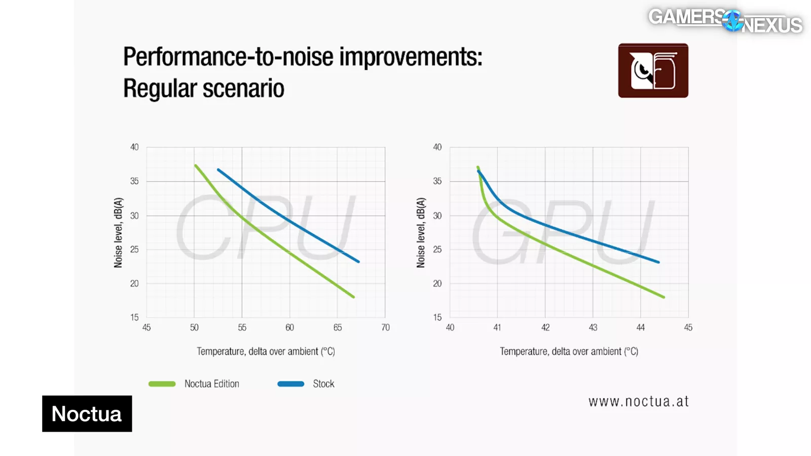Our charts don't contradict Noctua (so far). Noctua's claims about noise reduction are mostly based on noise-versus-temperature or noise-versus-air volume curves, meaning that the Noctua Edition should be quieter at given thresholds (for temperature or amounts of air moved).