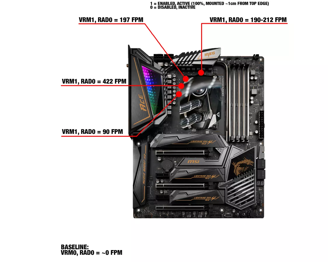This is obviously still plenty high on the other side of the heatsink (the side towards the fans) – north of 400FPM, actually – so it’s not like all cooling has vanished. That said, if you front-mount the radiator, having the VRM fan on the block could be somewhat beneficial in scenarios where an overly hot configuration is used and you have no fans at all in the top or rear of the case. However, most people should have at least one fan in one of those positions.