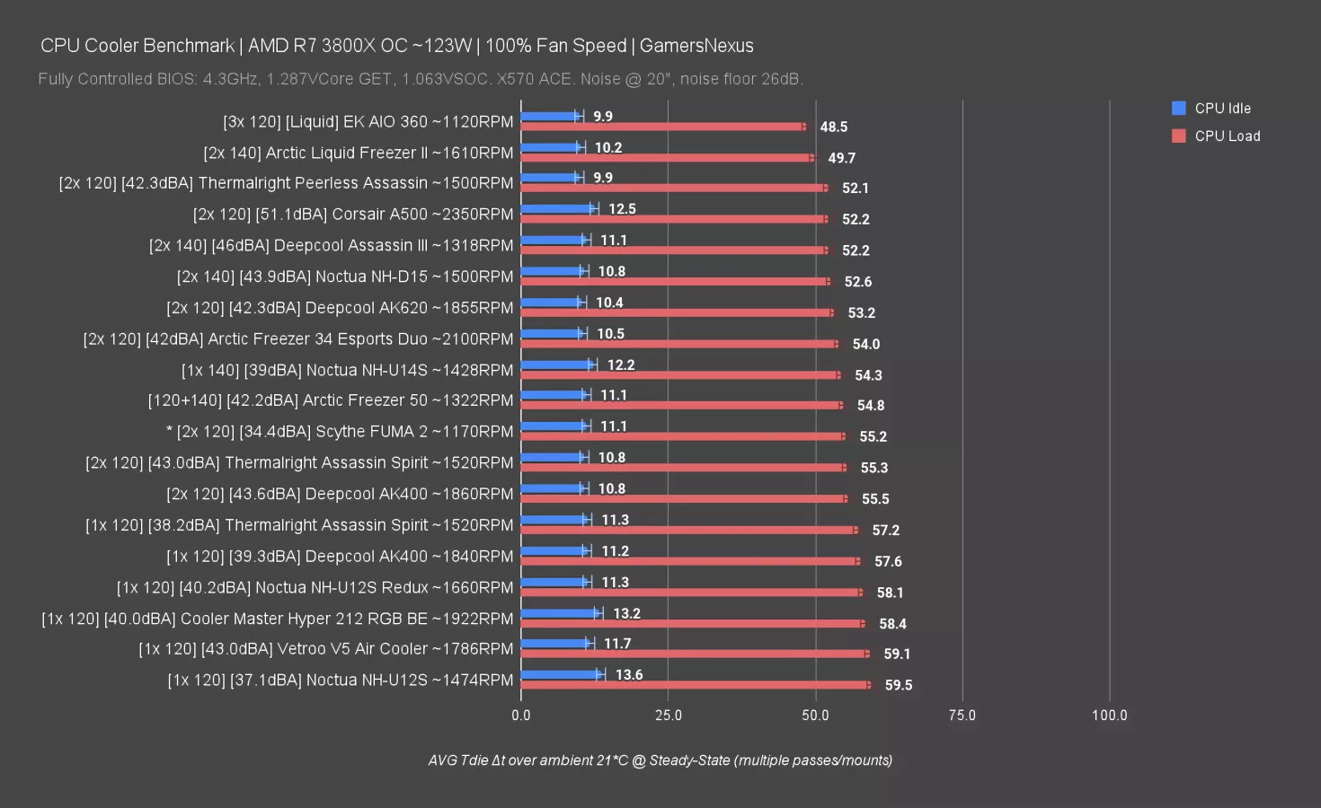 Our next test shows all of the coolers with their fans at 100% speed. This allows coolers with more powerful fans to brute force their way higher in the chart with the trade-off being higher noise levels.