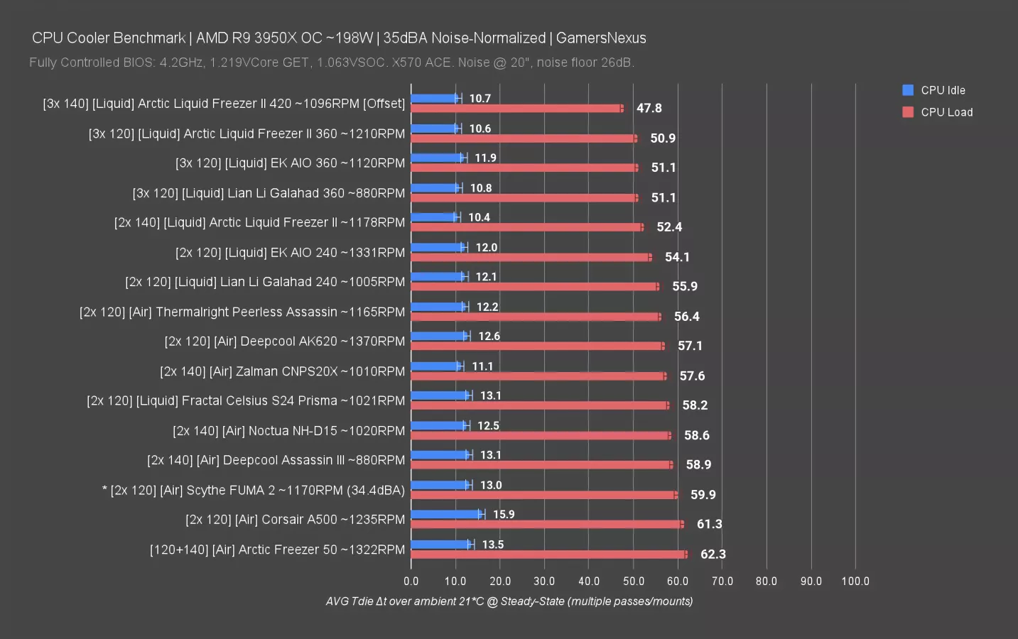 We’ll kick off the thermal testing with our 198W high heat test, similar to an overclocked AMD R9 CPU or a stock Intel i9 Alder Lake CPU. This first set of results is for 35dBA noise-normalized, so all coolers have equal noise levels.
