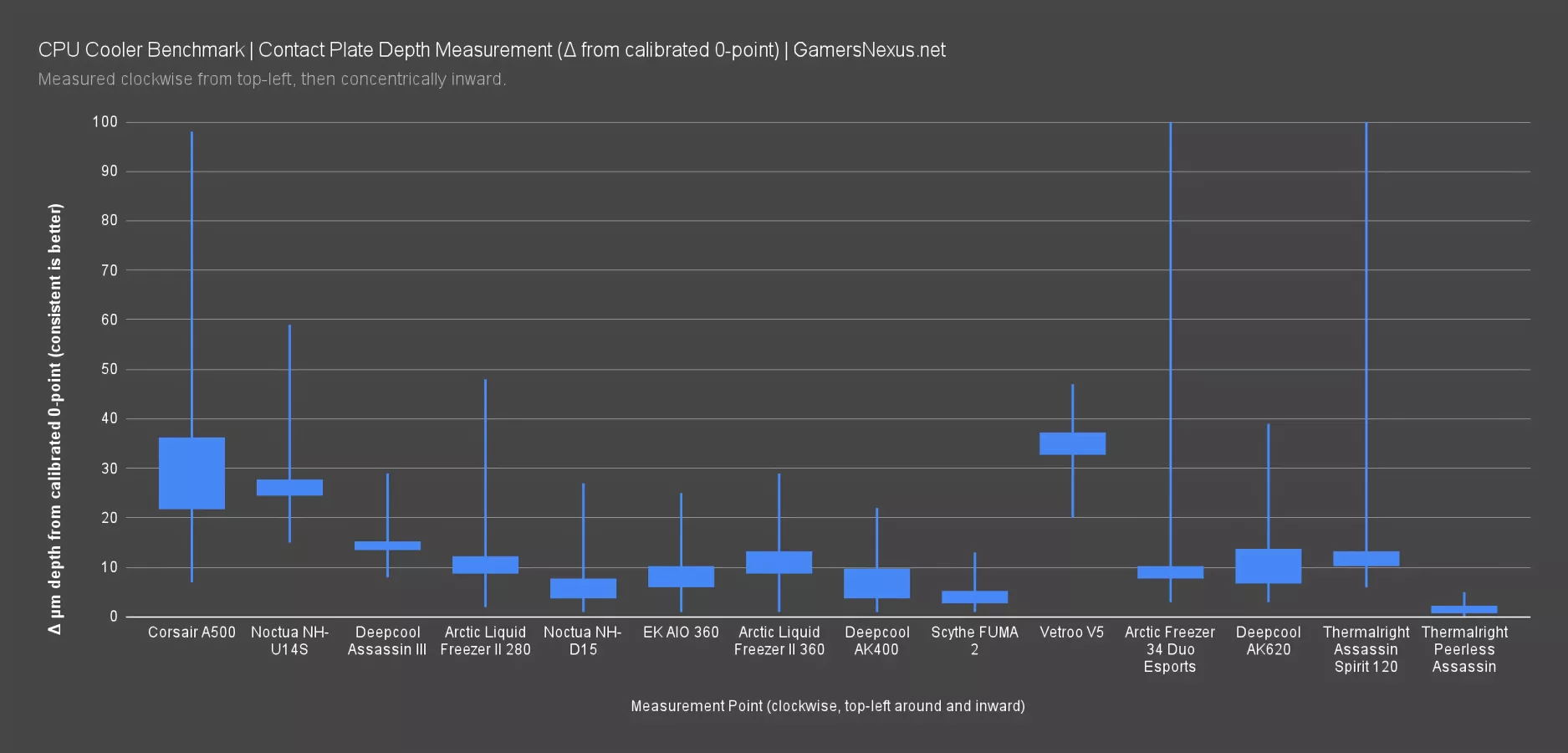 The Peerless Assassin 120 has a very narrow range of results, meaning average flatness is incredibly consistent, and the deepest outlier measurement is shallower than most other coolers’ average range. It doesn’t get much better than this, and we believe this has a direct correlation with the thermal results up next. In this regard, the flatness will help make up for places where the cooler might otherwise be facing more of a fight like in just general size of the fin stack.
