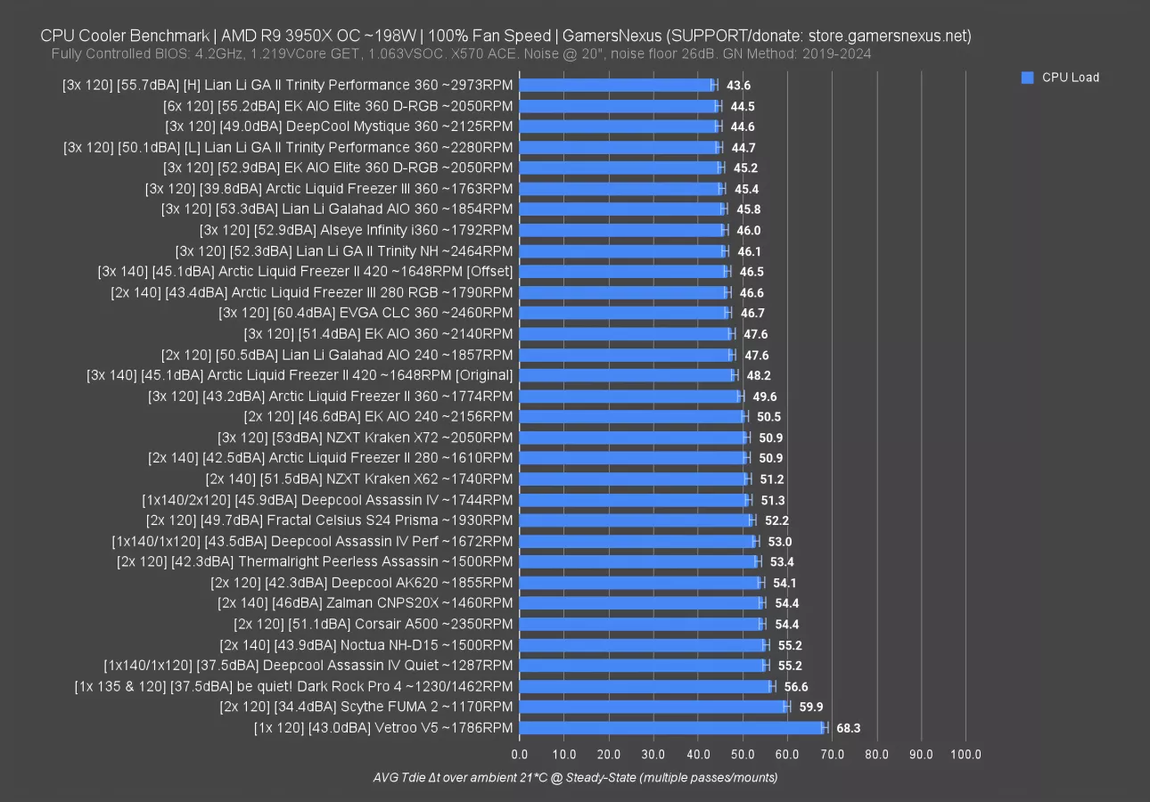Alongside the GA II Trinity series, the Mystique is among the newest coolers here. These both perform 1-2 degrees better, but while running significantly louder. The 56 dBA result for the Trinity Performance is comparatively deafening when matched against the Liquid Freezer III.