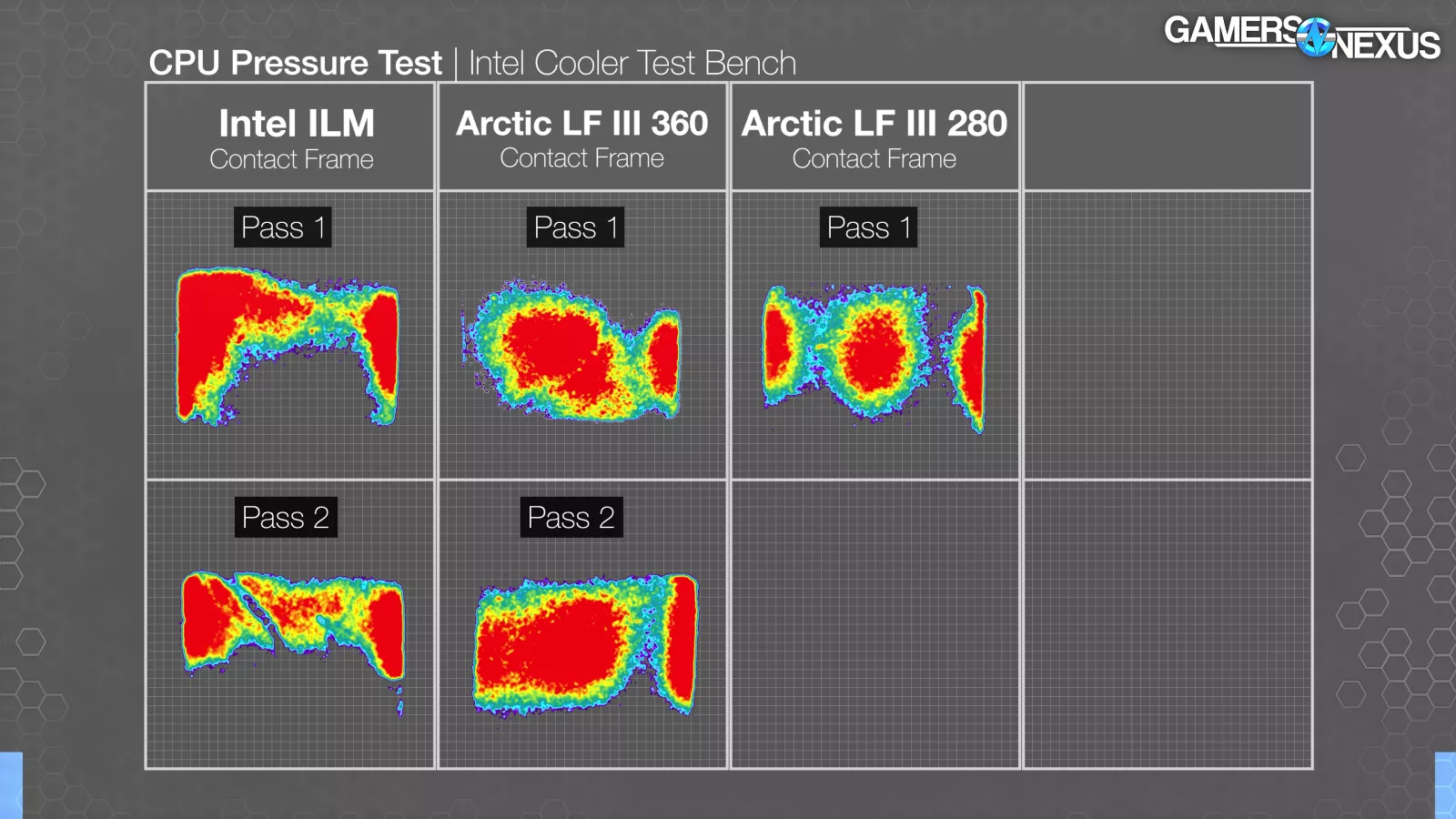 First on the left, we have the Intel stock ILM when using a Liquid Freezer II 420 -- the same one we used for our debut contact frame analysis almost two years ago. We can’t use the Liquid Freezer III here because, again, it doesn’t have an ILM mounting option. The Intel stock ILM was sorely lacking in pressure on the bottom edge of the CPU, with the right edge pointed toward the VRM. Intel is weak here overall and has its pressure in the wrong places.