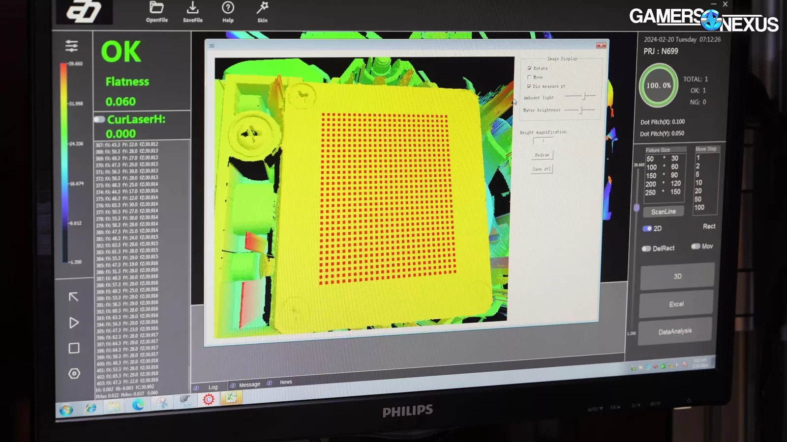 Here’s the scan. After adjusting the scanlines and levelness of the cold plate, we eventually ended up with this result. Without magnifying it, everything looks relatively flat. We have a maximum point-to-point delta of 60 microns, but an overall good consistency one point to its adjacent neighbor. We were hoping this would reveal that channel we identified in the LGA1700 mounting pressure map, but because we can’t conduct this scan while the cold plate is mounted to an IHS, we can only see the unsprung version.
