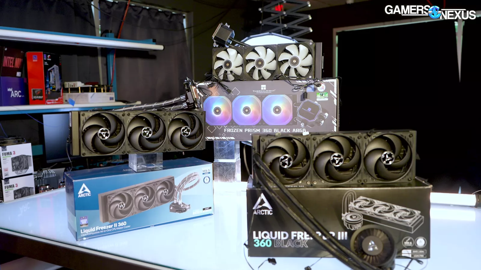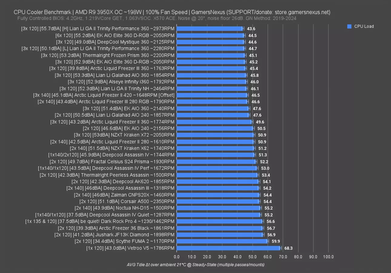 100% fan speed on all coolers is up now. Thermalright’s Frozen Prism hits 53dBA here with our prior noise testing methods, which has it louder than the now-banned DeepCool Mystique 360 and significantly louder than the not-banned Arctic Liquid Freezer III 360, which was about 40dBA in this testing process. That’s a big noise advantage for the Arctic solution. Thermally, it’s within error of the Thermalright Frozen Prism, so the Liquid Freezer III is definitely a substantially better cooler than the Frozen Prism. Even still, the Prism does OK to brute force its position. It manages a top rank, despite achieving it in an acoustically inefficient way.