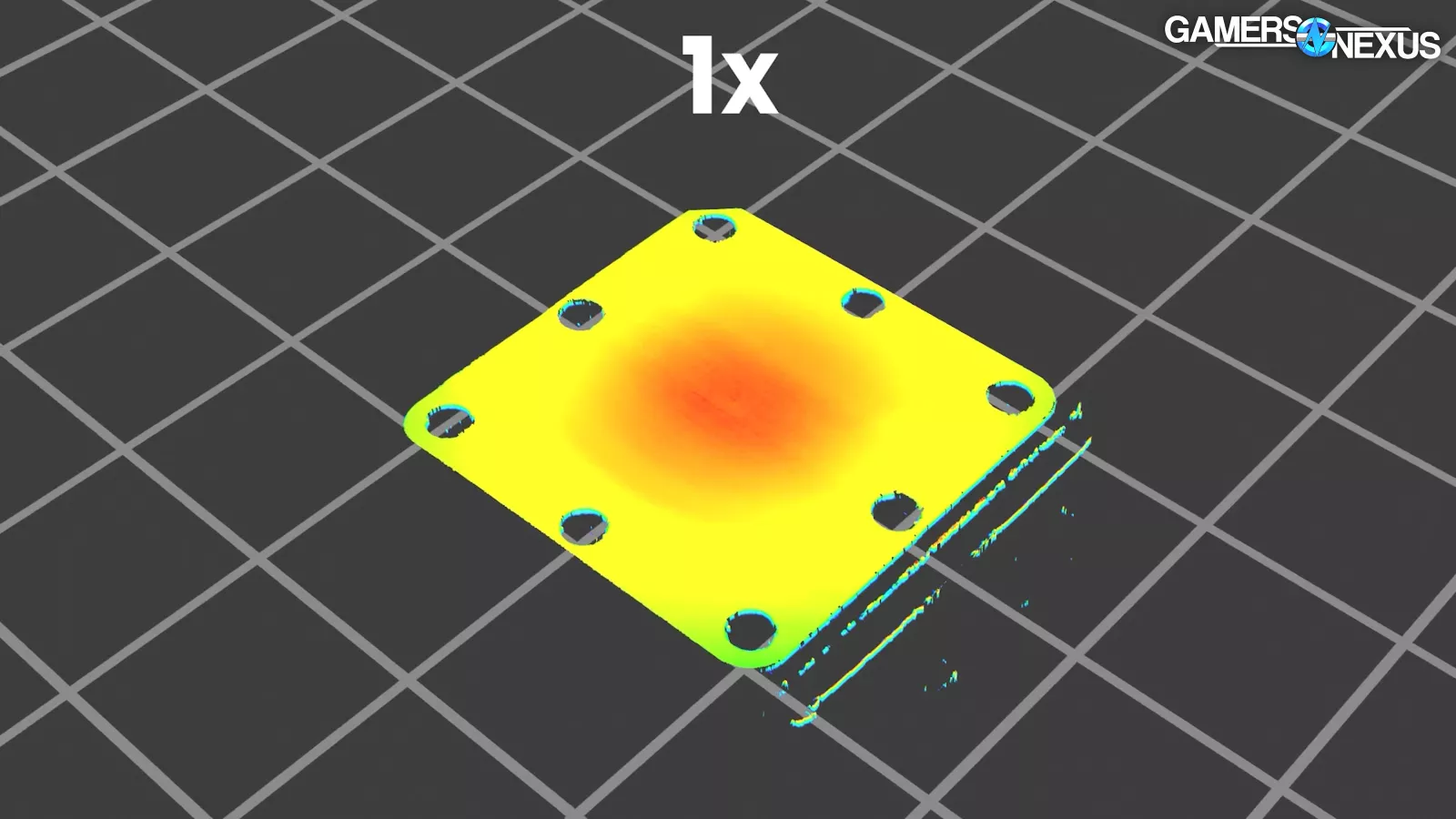 For the Thermalright Frozen Prism, you can see at 1x zoom, the central area is curved toward the laser, which is indicated by that red part of the heat map. That’d make it convex toward the CPU, which is typically concave for Intel CPUs. We showed this in our IHS scans previously for the Scythe content.