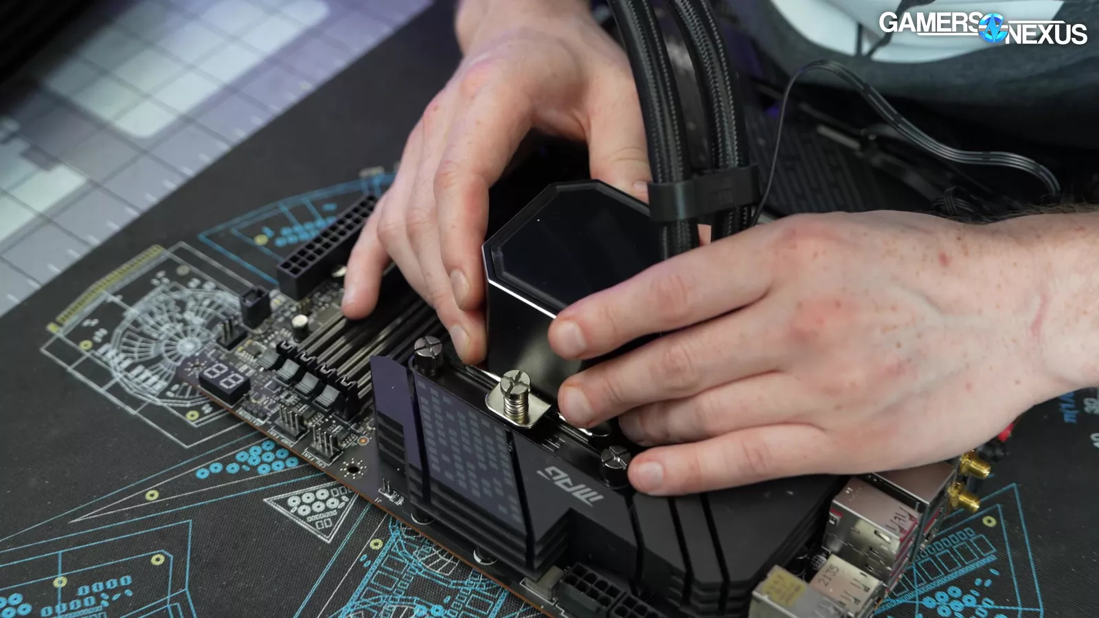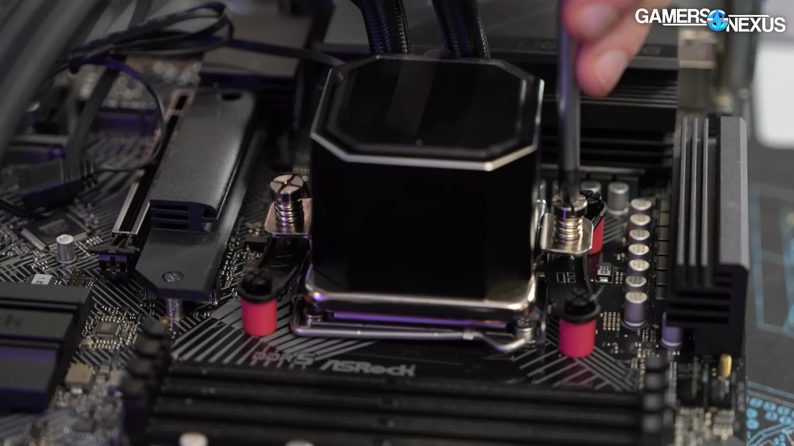 With the thermal paste applied, it’s time to place the cold plate down onto the IHS and tighten both screws.