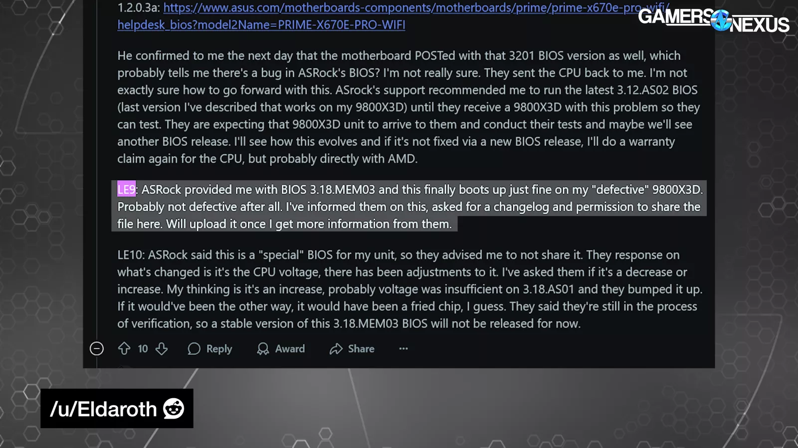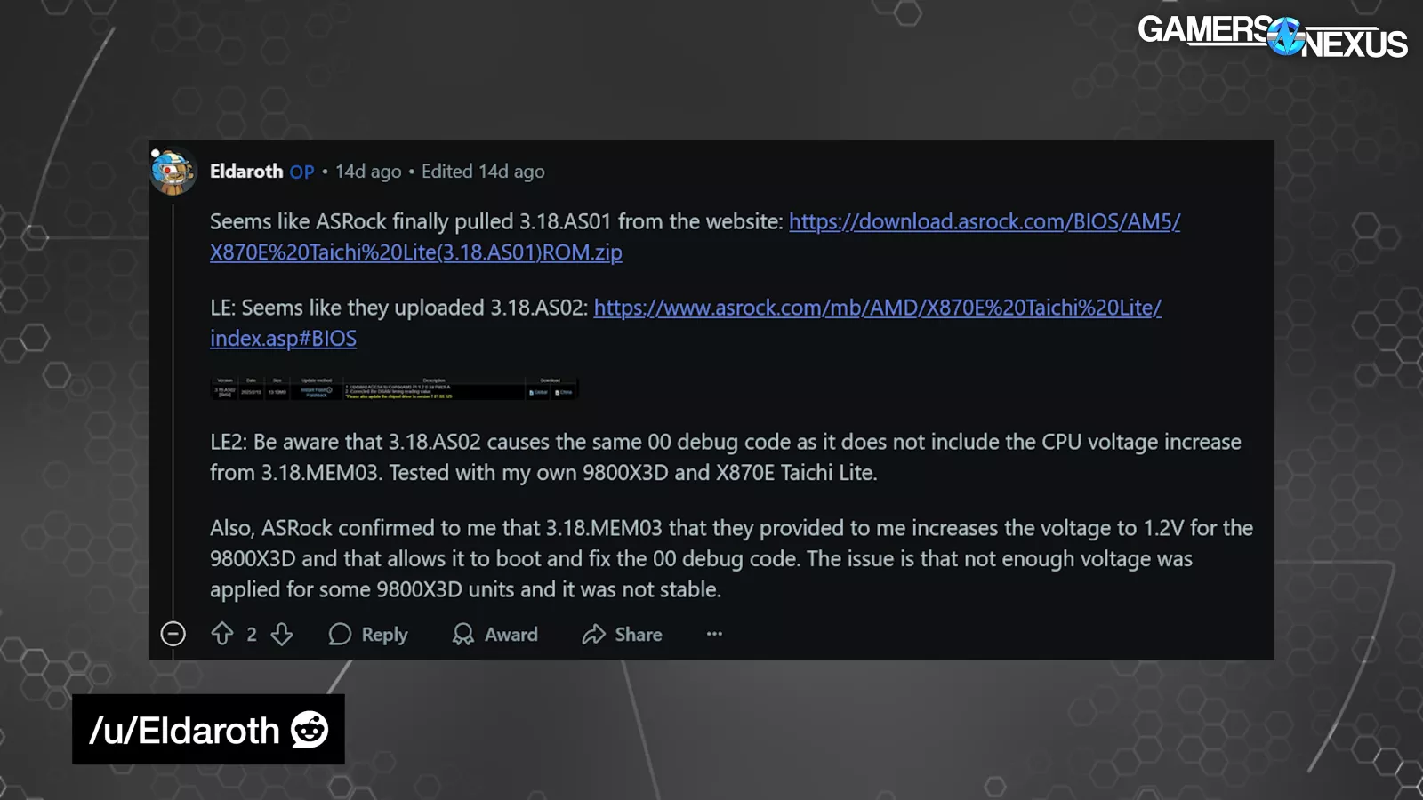 The other user with the new BIOS claimed: “ASRock confirmed to me that 3.18.MEM03 that they provided to me increases the voltage to 1.2V for the 9800X3D and that allows it to boot and fix the 00 debug code. The issue is that not enough voltage was applied for some 9800X3D units and it was not stable.” Both users reported this BIOS resolved their situation.