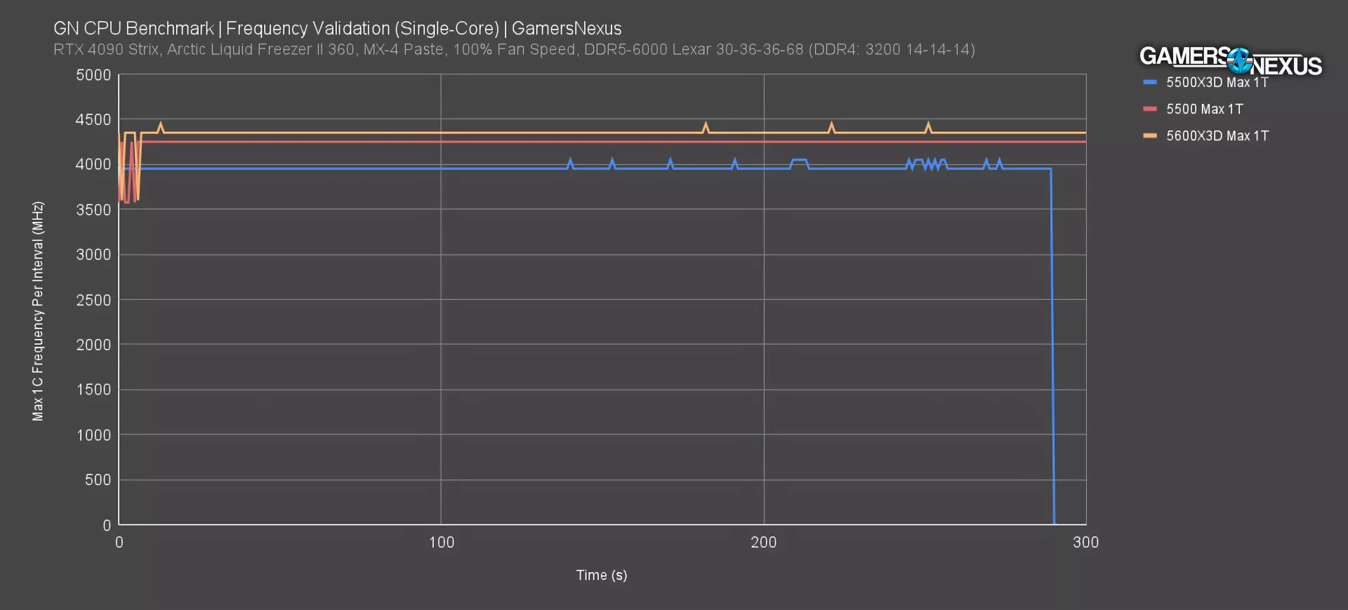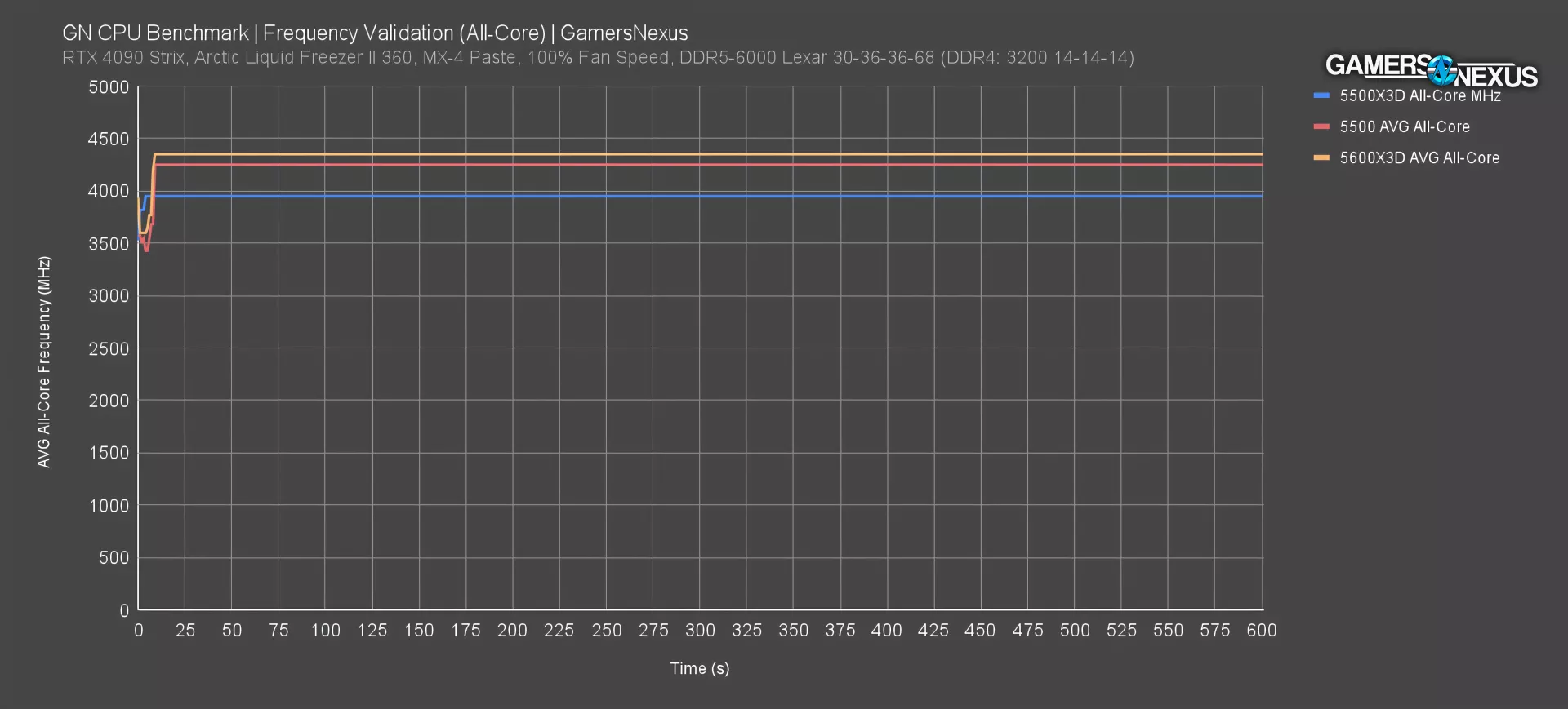 The 5500 non-X3D hit 4250 MHz again, with the 5600X3D at 4350 MHz.