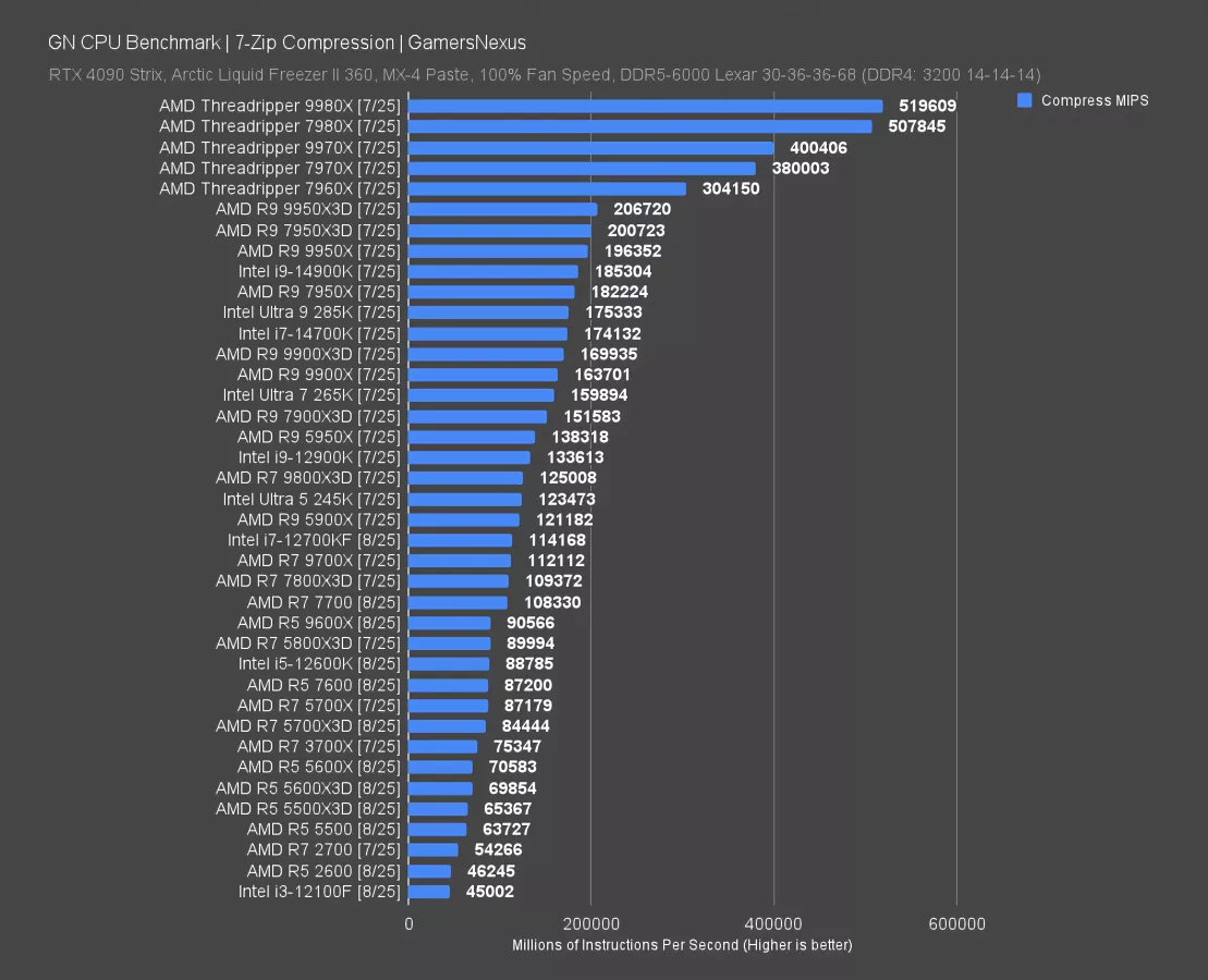 In 7-Zip compression testing, the 5500X3D ran at about the same performance level as the 5600X3D. Results are in millions of instructions per second, with the 5500X3D completing 65K MIPS, the 5600X3D at about 70K MIPS, the regular 5500 at 64K MIPS, and the venerable 5800X3D completing 90K MIPS. The 5800X3D and 5700X3D both benefit from a higher core count, with the 5800X3D in particular at 38% ahead of the 5500X3D CPU. The 12600K is similar to the 5800X3D in this test.