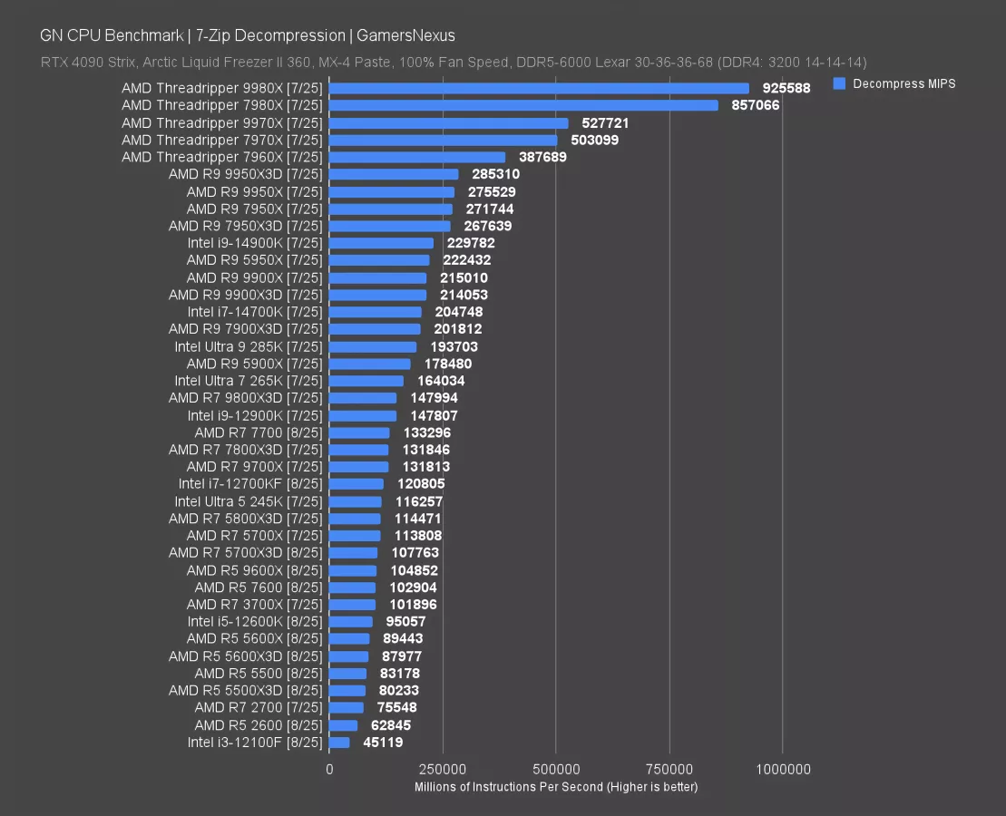 Decompression is next. This test has the 5500X3D at 80K MIPS, landing just below the R5 5500, which benefits from the higher frequency that we showed earlier.