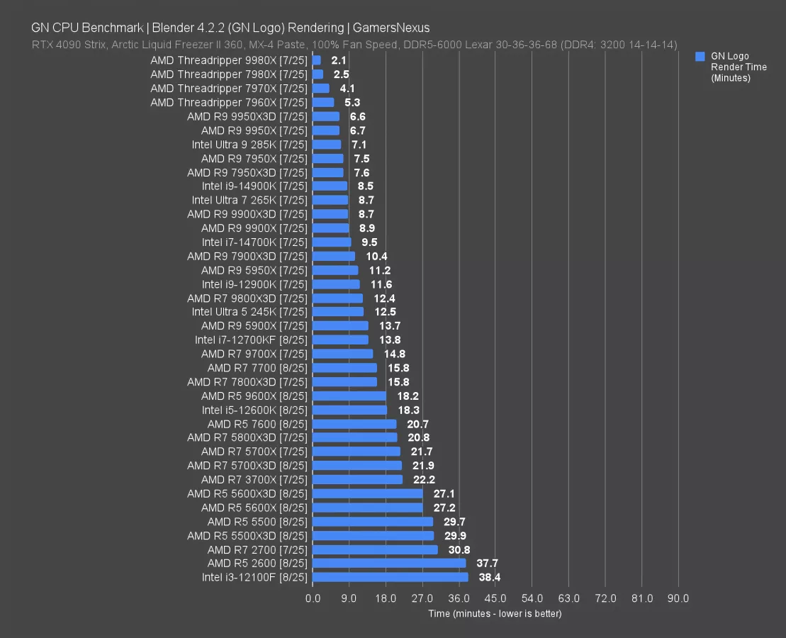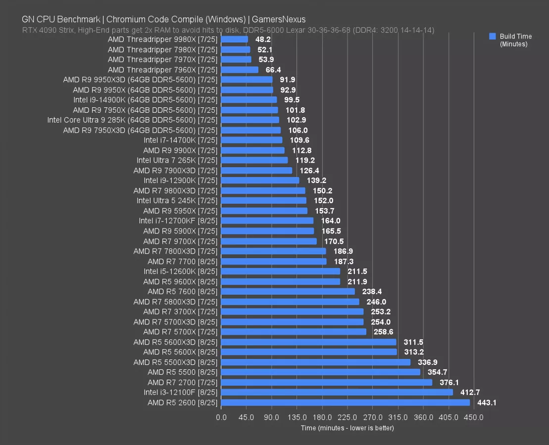 Intel’s 12600K (watch our review) has about the same performance as the 5500X3D. The 12700KF is a bit better, with the 245K (read our review) improved somewhat notably to 52 seconds, though we still don’t recommend the 200 series of CPUs.